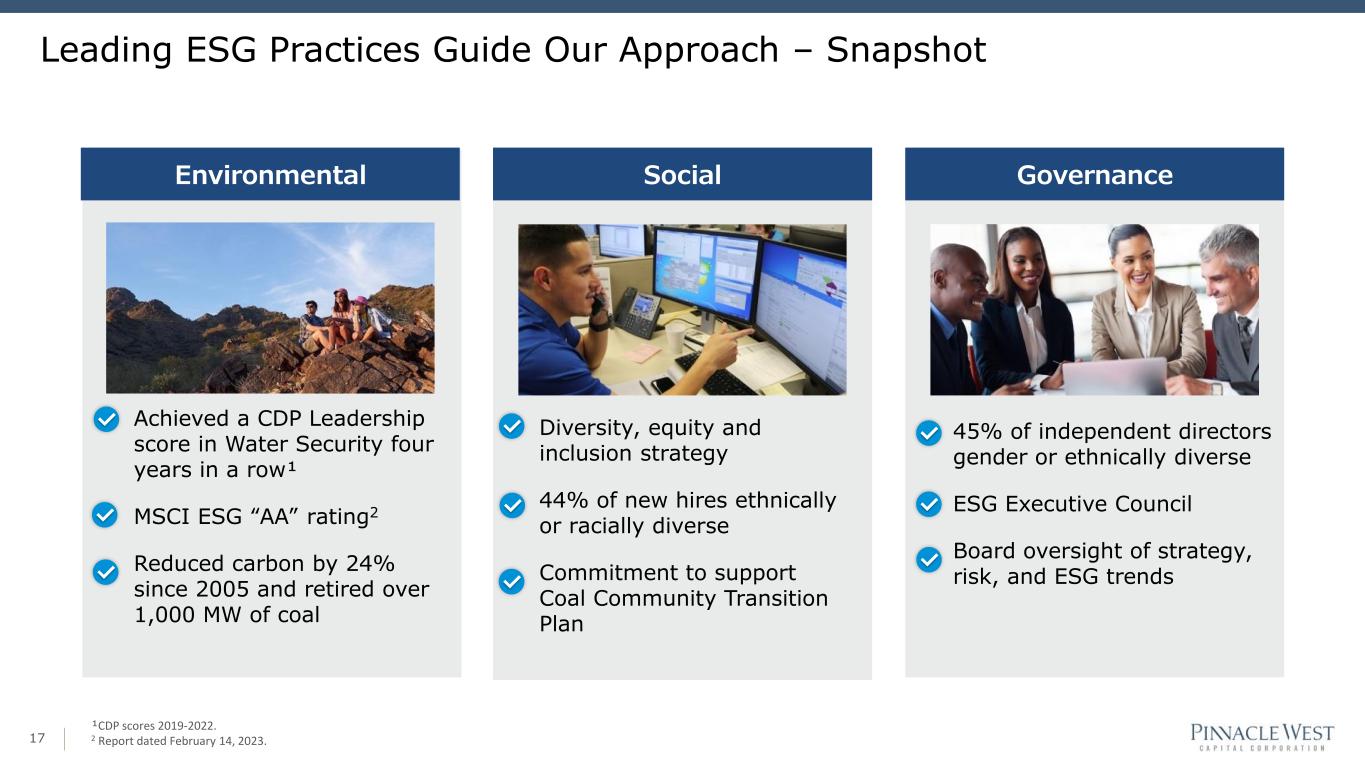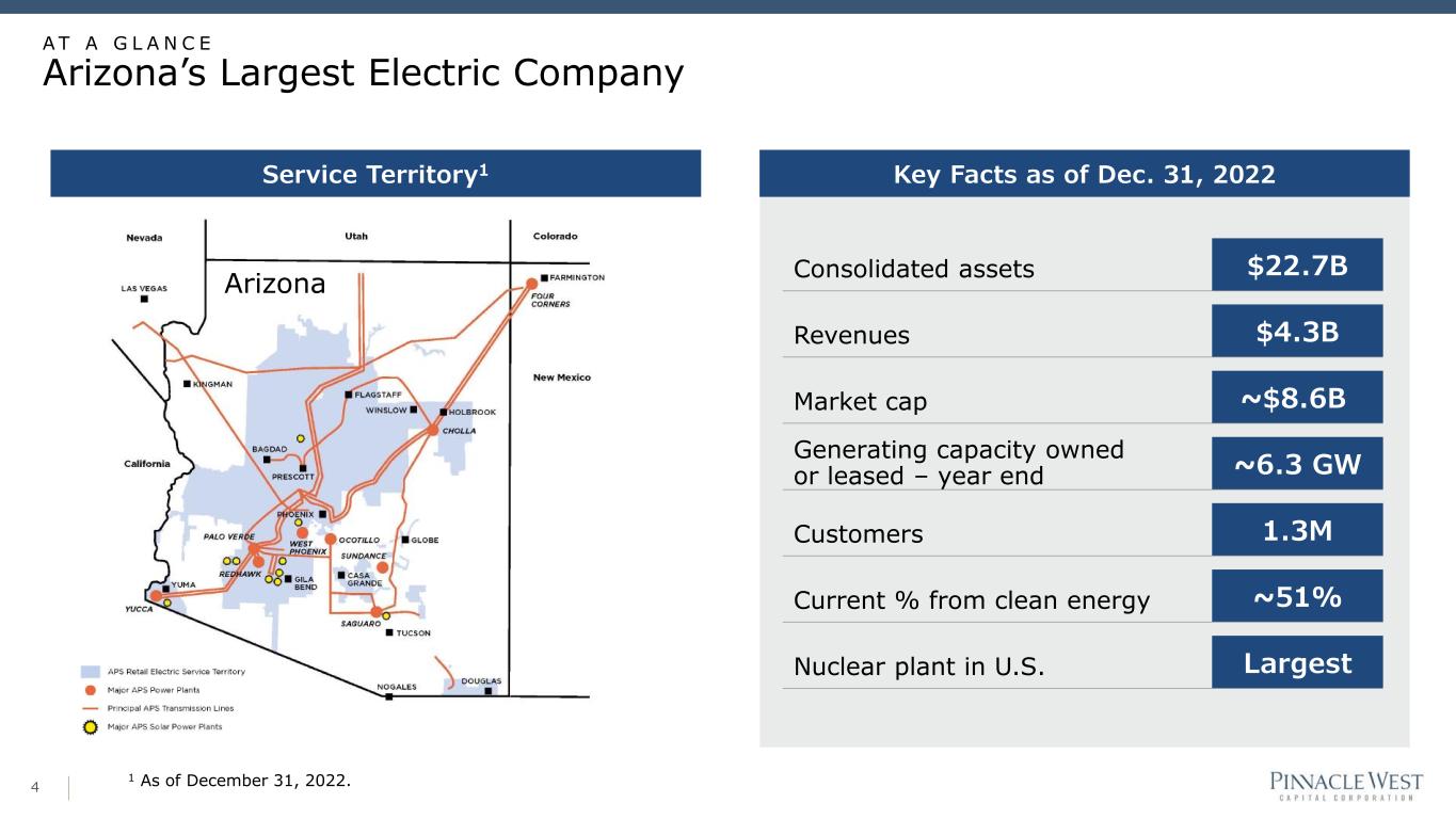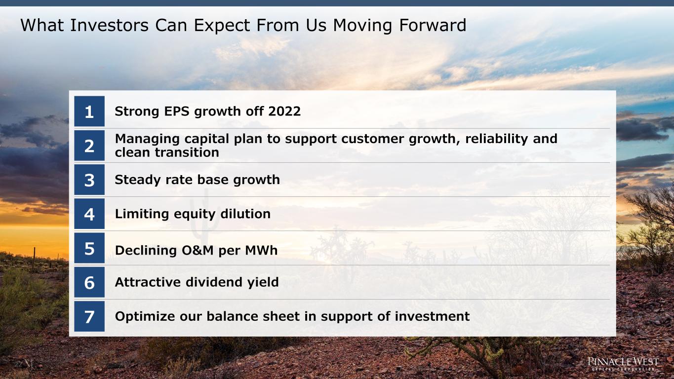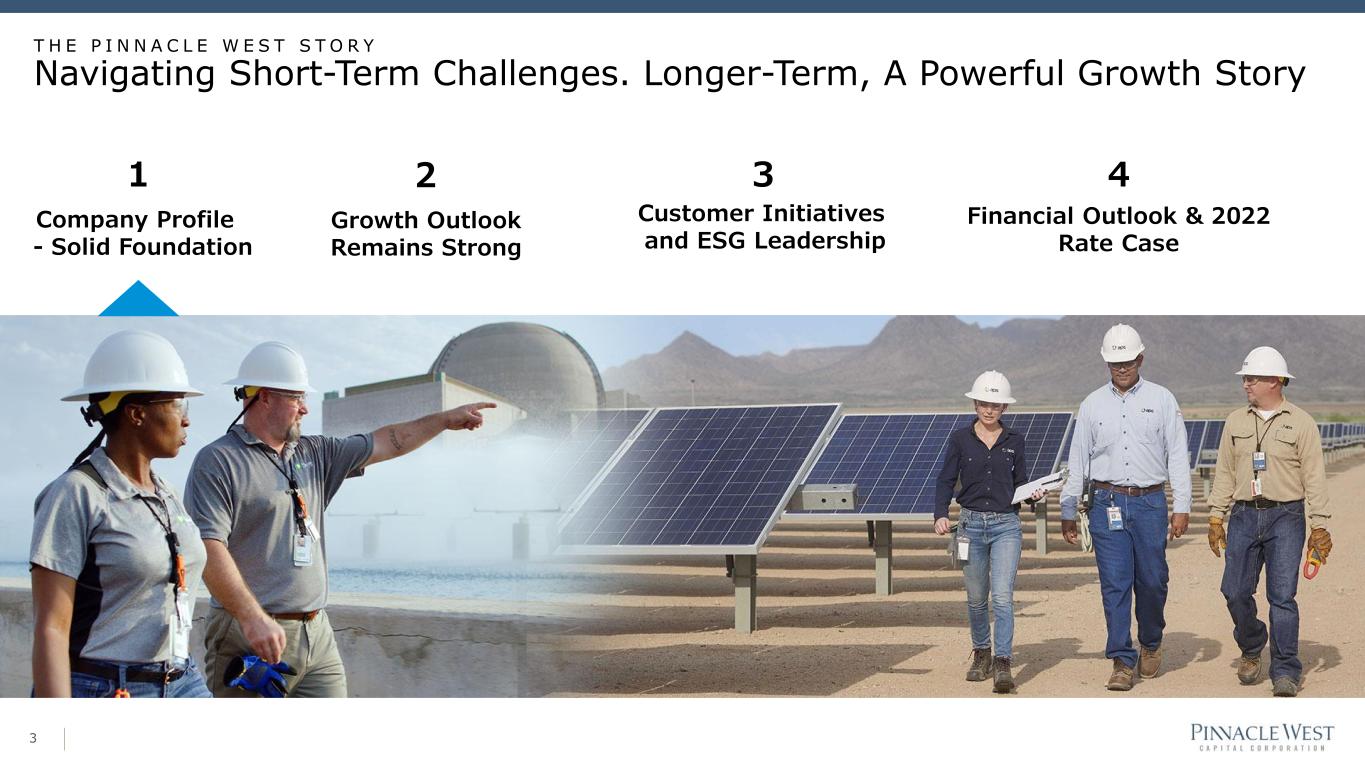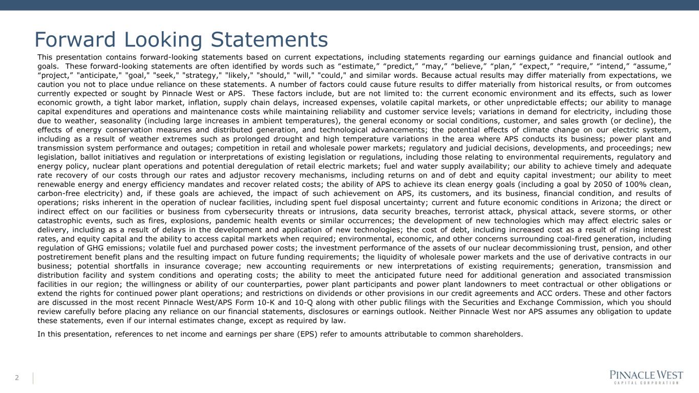 Forward Looking Statements 2 This presentation contains forward-looking statements based on current expectations, including statements regarding our earnings guidance and financial outlook and goals. These forward-looking statements are often identified by words such as “estimate,” “predict,” “may,” “believe,” “plan,” “expect,” “require,” “intend,” “assume,” “project,” "anticipate," "goal," "seek," "strategy," "likely," "should," "will," "could," and similar words. Because actual results may differ materially from expectations, we caution you not to place undue reliance on these statements. A number of factors could cause future results to differ materially from historical results, or from outcomes currently expected or sought by Pinnacle West or APS. These factors include, but are not limited to: the current economic environment and its effects, such as lower economic growth, a tight labor market, inflation, supply chain delays, increased expenses, volatile capital markets, or other unpredictable effects; our ability to manage capital expenditures and operations and maintenance costs while maintaining reliability and customer service levels; variations in demand for electricity, including those due to weather, seasonality (including large increases in ambient temperatures), the general economy or social conditions, customer, and sales growth (or decline), the effects of energy conservation measures and distributed generation, and technological advancements; the potential effects of climate change on our electric system, including as a result of weather extremes such as prolonged drought and high temperature variations in the area where APS conducts its business; power plant and transmission system performance and outages; competition in retail and wholesale power markets; regulatory and judicial decisions, developments, and proceedings; new legislation, ballot initiatives and regulation or interpretations of existing legislation or regulations, including those relating to environmental requirements, regulatory and energy policy, nuclear plant operations and potential deregulation of retail electric markets; fuel and water supply availability; our ability to achieve timely and adequate rate recovery of our costs through our rates and adjustor recovery mechanisms, including returns on and of debt and equity capital investment; our ability to meet renewable energy and energy efficiency mandates and recover related costs; the ability of APS to achieve its clean energy goals (including a goal by 2050 of 100% clean, carbon-free electricity) and, if these goals are achieved, the impact of such achievement on APS, its customers, and its business, financial condition, and results of operations; risks inherent in the operation of nuclear facilities, including spent fuel disposal uncertainty; current and future economic conditions in Arizona; the direct or indirect effect on our facilities or business from cybersecurity threats or intrusions, data security breaches, terrorist attack, physical attack, severe storms, or other catastrophic events, such as fires, explosions, pandemic health events or similar occurrences; the development of new technologies which may affect electric sales or delivery, including as a result of delays in the development and application of new technologies; the cost of debt, including increased cost as a result of rising interest rates, and equity capital and the ability to access capital markets when required; environmental, economic, and other concerns surrounding coal-fired generation, including regulation of GHG emissions; volatile fuel and purchased power costs; the investment performance of the assets of our nuclear decommissioning trust, pension, and other postretirement benefit plans and the resulting impact on future funding requirements; the liquidity of wholesale power markets and the use of derivative contracts in our business; potential shortfalls in insurance coverage; new accounting requirements or new interpretations of existing requirements; generation, transmission and distribution facility and system conditions and operating costs; the ability to meet the anticipated future need for additional generation and associated transmission facilities in our region; the willingness or ability of our counterparties, power plant participants and power plant landowners to meet contractual or other obligations or extend the rights for continued power plant operations; and restrictions on dividends or other provisions in our credit agreements and ACC orders. These and other factors are discussed in the most recent Pinnacle West/APS Form 10-K and 10-Q along with other public filings with the Securities and Exchange Commission, which you should review carefully before placing any reliance on our financial statements, disclosures or earnings outlook. Neither Pinnacle West nor APS assumes any obligation to update these statements, even if our internal estimates change, except as required by law. In this presentation, references to net income and earnings per share (EPS) refer to amounts attributable to common shareholders.