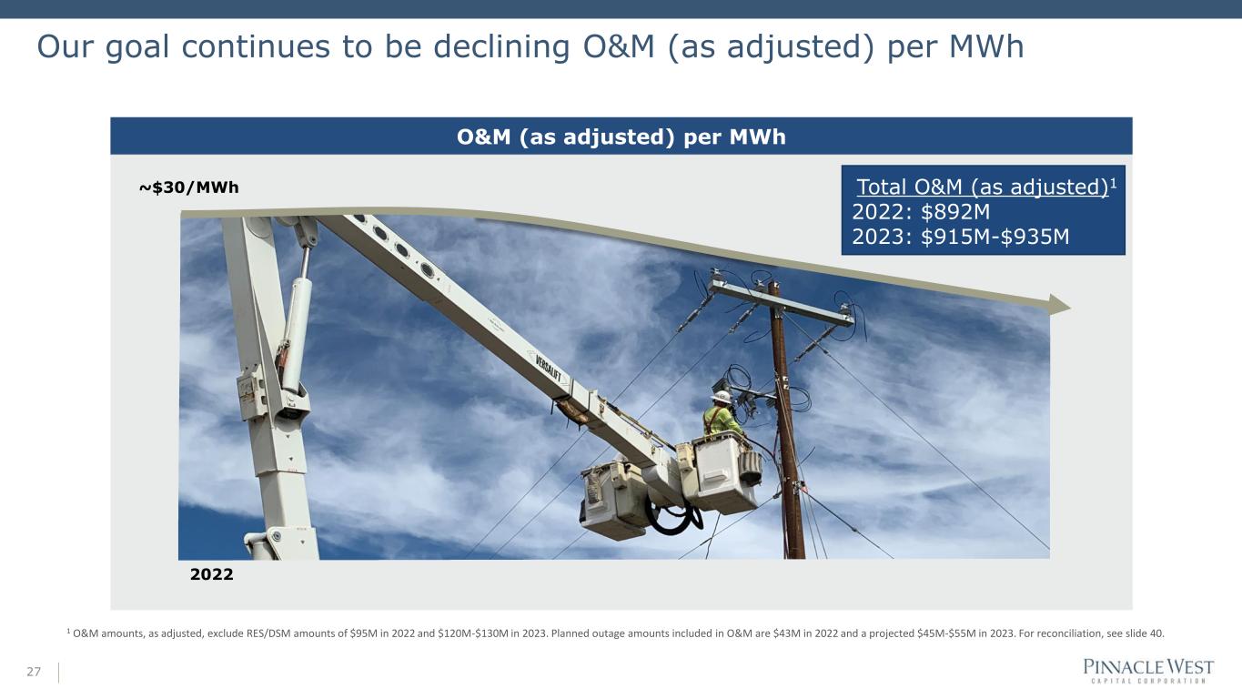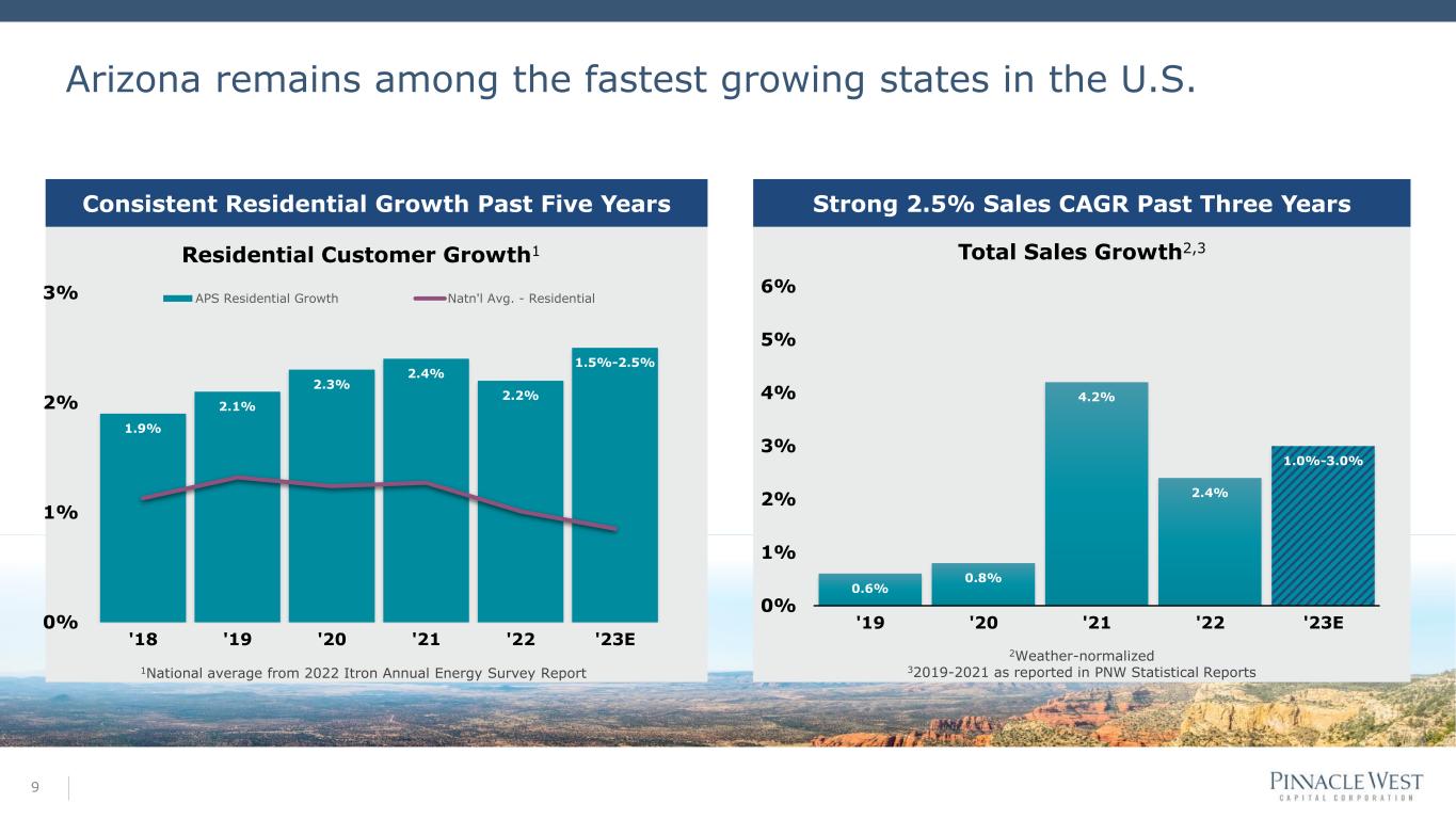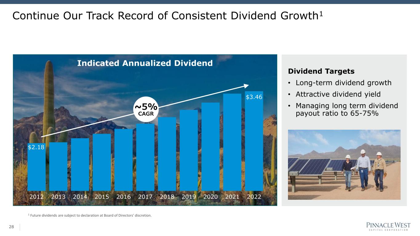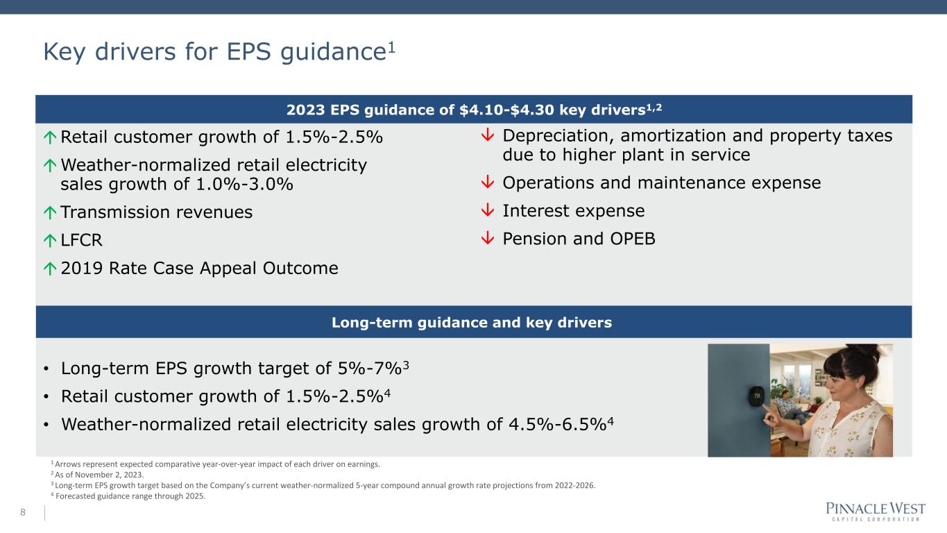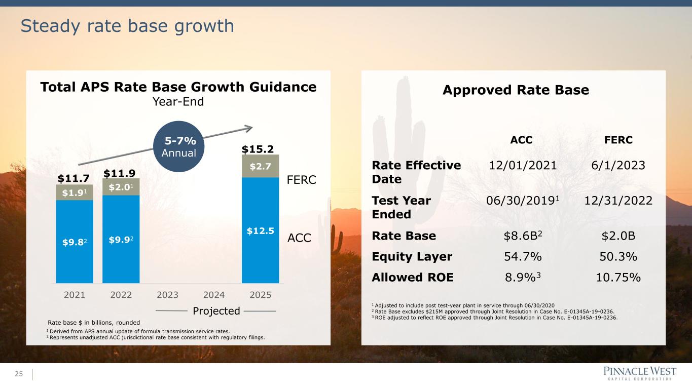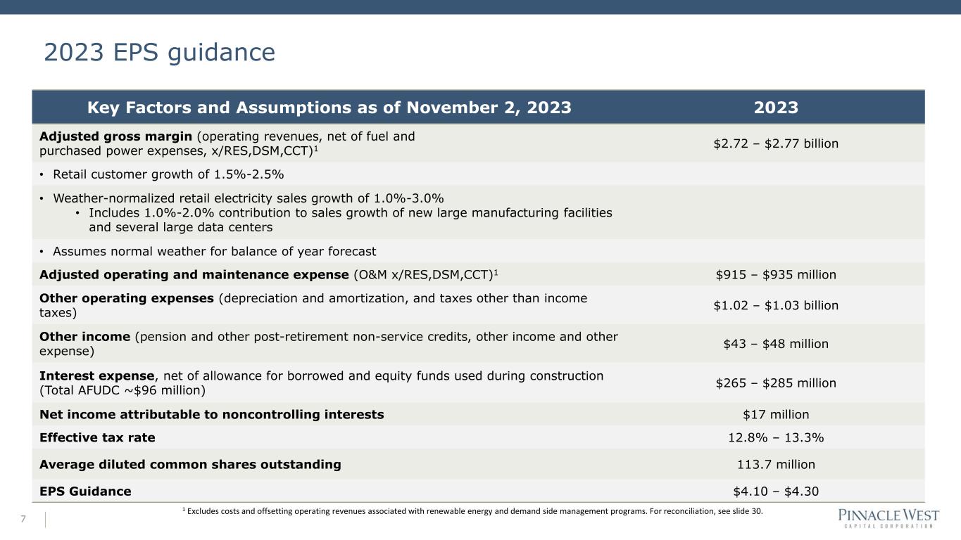 Forward Looking Statements 2 This presentation contains forward-looking statements based on current expectations, including statements regarding our earnings guidance and financial outlook and goals. These forward-looking statements are often identified by words such as “estimate,” “predict,” “may,” “believe,” “plan,” “expect,” “require,” “intend,” “assume,” “project,” "anticipate," "goal," "seek," "strategy," "likely," "should," "will," "could," and similar words. Because actual results may differ materially from expectations, we caution you not to place undue reliance on these statements. A number of factors could cause future results to differ materially from historical results, or from outcomes currently expected or sought by Pinnacle West or APS. These factors include, but are not limited to: the current economic environment and its effects, such as lower economic growth, a tight labor market, inflation, supply chain delays, increased expenses, volatile capital markets, or other unpredictable effects; our ability to manage capital expenditures and operations and maintenance costs while maintaining reliability and customer service levels; variations in demand for electricity, including those due to weather, seasonality (including large increases in ambient temperatures), the general economy or social conditions, customer, and sales growth (or decline), the effects of energy conservation measures and distributed generation, and technological advancements; the potential effects of climate change on our electric system, including as a result of weather extremes such as prolonged drought and high temperature variations in the area where APS conducts its business; power plant and transmission system performance and outages; competition in retail and wholesale power markets; regulatory and judicial decisions, developments, and proceedings; new legislation, ballot initiatives and regulation or interpretations of existing legislation or regulations, including those relating to environmental requirements, regulatory and energy policy, nuclear plant operations and potential deregulation of retail electric markets; fuel and water supply availability; our ability to achieve timely and adequate rate recovery of our costs through our rates and adjustor recovery mechanisms, including returns on and of debt and equity capital investment; our ability to meet renewable energy and energy efficiency mandates and recover related costs; the ability of APS to achieve its clean energy goals (including a goal by 2050 of 100% clean, carbon-free electricity) and, if these goals are achieved, the impact of such achievement on APS, its customers, and its business, financial condition, and results of operations; risks inherent in the operation of nuclear facilities, including spent fuel disposal uncertainty; current and future economic conditions in Arizona; the direct or indirect effect on our facilities or business from cybersecurity threats or intrusions, data security breaches, terrorist attack, physical attack, severe storms, or other catastrophic events, such as fires, explosions, pandemic health events or similar occurrences; the development of new technologies which may affect electric sales or delivery, including as a result of delays in the development and application of new technologies; the cost of debt, including increased cost as a result of rising interest rates, and equity capital and the ability to access capital markets when required; environmental, economic, and other concerns surrounding coal-fired generation, including regulation of GHG emissions; volatile fuel and purchased power costs; the investment performance of the assets of our nuclear decommissioning trust, pension, and other postretirement benefit plans and the resulting impact on future funding requirements; the liquidity of wholesale power markets and the use of derivative contracts in our business; potential shortfalls in insurance coverage; new accounting requirements or new interpretations of existing requirements; generation, transmission and distribution facility and system conditions and operating costs; the ability to meet the anticipated future need for additional generation and associated transmission facilities in our region; the willingness or ability of our counterparties, power plant participants and power plant landowners to meet contractual or other obligations or extend the rights for continued power plant operations; and restrictions on dividends or other provisions in our credit agreements and ACC orders. These and other factors are discussed in the most recent Pinnacle West/APS Form 10-K and 10-Q along with other public filings with the Securities and Exchange Commission, which you should review carefully before placing any reliance on our financial statements, disclosures or earnings outlook. Neither Pinnacle West nor APS assumes any obligation to update these statements, even if our internal estimates change, except as required by law. In this presentation, references to net income and earnings per share (EPS) refer to amounts attributable to common shareholders.