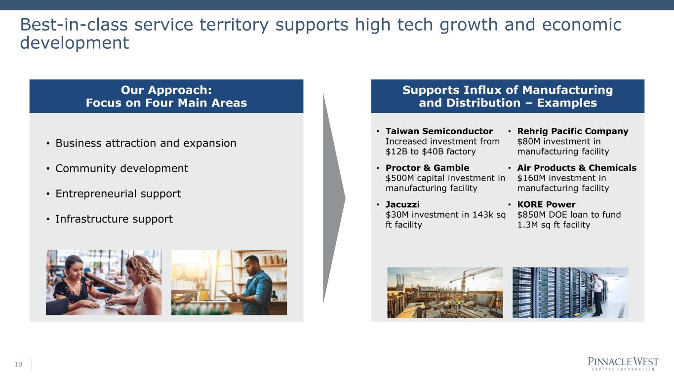 Arizona remains among the fastest growing states in the U.S. 9 Consistent Residential Growth Past Five Years Strong 2.5% Sales CAGR Past Three Years 0.6% 0.8% 4.2% 2.4% 1.0%-3.0% 0% 1% 2% 3% 4% 5% 6% '19 '20 '21 '22 '23E Total Sales Growth2,3 2Weather-normalized 32019-2021 as reported in PNW Statistical Reports 1.9% 2.1% 2.3% 2.4% 2.2% 1.5%-2.5% 0% 1% 2% 3% '18 '19 '20 '21 '22 '23E APS Residential Growth Natn'l Avg. - Residential Residential Customer Growth1 1National average from 2022 Itron Annual Energy Survey Report