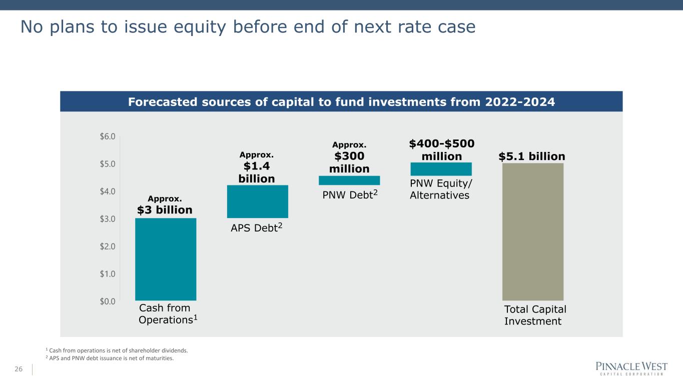 Approved Rate BaseTotal APS Rate Base Growth Guidance Year-End Steady rate base growth 25 ACC FERC Rate Effective Date 12/01/2021 6/1/2023 Test Year Ended 06/30/20191 12/31/2022 Rate Base $8.6B2 $2.0B Equity Layer 54.7% 50.3% Allowed ROE 8.9%3 10.75% 1 Adjusted to include post test-year plant in service through 06/30/2020 2 Rate Base excludes $215M approved through Joint Resolution in Case No. E-01345A-19-0236. 3 ROE adjusted to reflect ROE approved through Joint Resolution in Case No. E-01345A-19-0236. Rate base $ in billions, rounded $9.82 $9.92 $12.5 $1.91 $2.01 $2.7 2021 2022 2023 2024 2025 $11.9 Projected 5-7% Annual FERC ACC $11.7 $15.2 1 Derived from APS annual update of formula transmission service rates. 2 Represents unadjusted ACC jurisdictional rate base consistent with regulatory filings.