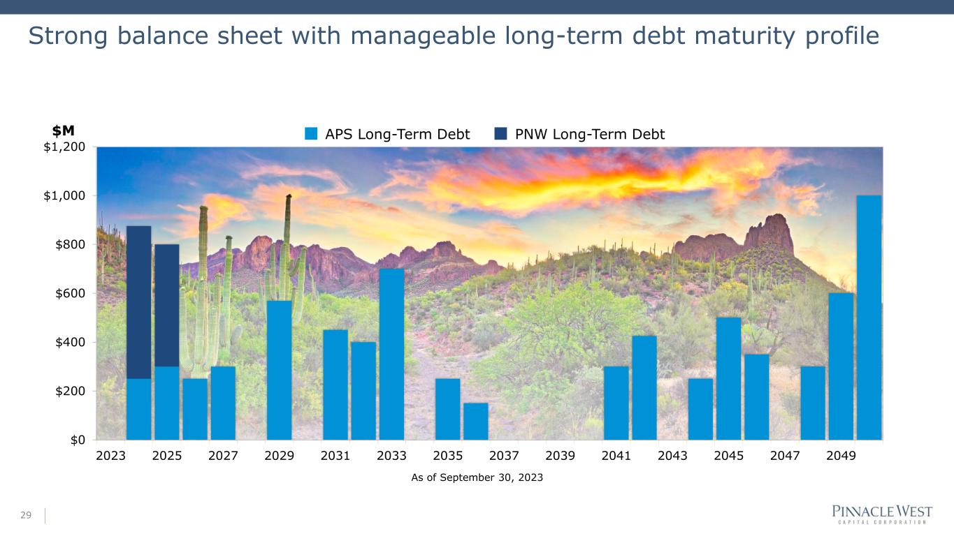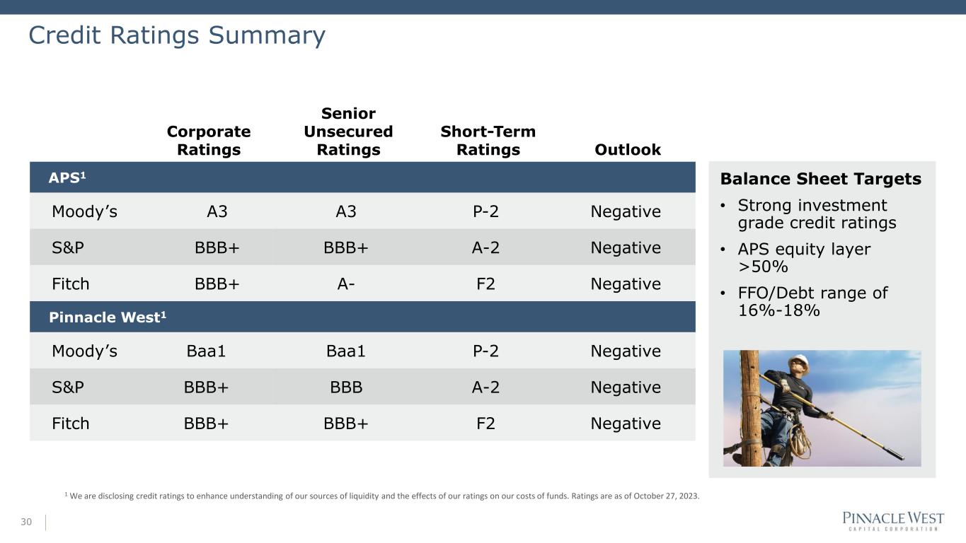 Strong balance sheet with manageable long-term debt maturity profile 29 $M PNW Long-Term DebtAPS Long-Term Debt $0 $200 $400 $600 $800 $1,000 $1,200 2023 2025 2027 2029 2031 2033 2035 2037 2039 2041 2043 2045 2047 2049 As of September 30, 2023