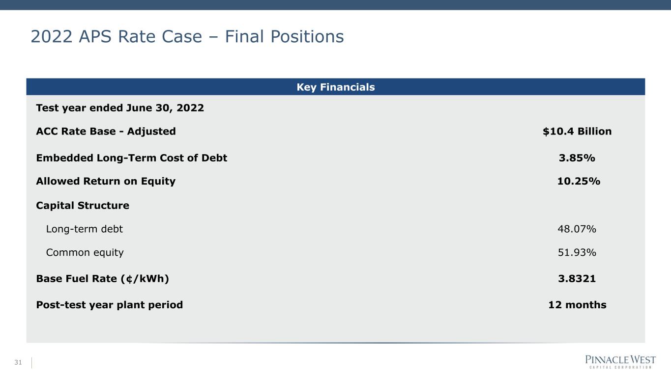 Credit Ratings Summary 30 Corporate Ratings Senior Unsecured Ratings Short-Term Ratings Outlook APS1 Moody’s A3 A3 P-2 Negative S&P BBB+ BBB+ A-2 Negative Fitch BBB+ A- F2 Negative Pinnacle West1 Moody’s Baa1 Baa1 P-2 Negative S&P BBB+ BBB A-2 Negative Fitch BBB+ BBB+ F2 Negative Balance Sheet Targets • Strong investment grade credit ratings • APS equity layer >50% • FFO/Debt range of 16%-18% 1 We are disclosing credit ratings to enhance understanding of our sources of liquidity and the effects of our ratings on our costs of funds. Ratings are as of October 27, 2023.