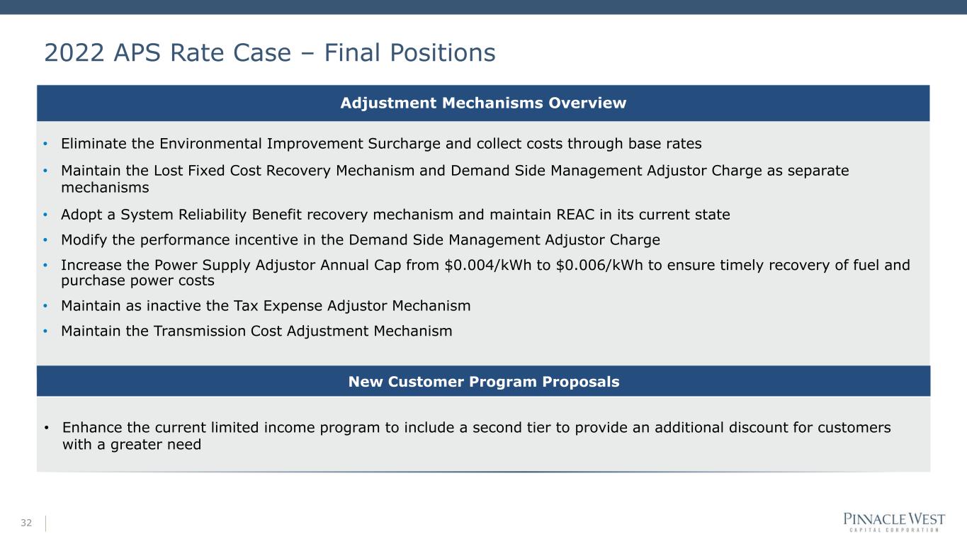 2022 APS Rate Case – Final Positions 31 Key Financials Test year ended June 30, 2022 ACC Rate Base - Adjusted $10.4 Billion Embedded Long-Term Cost of Debt 3.85% Allowed Return on Equity 10.25% Capital Structure Long-term debt 48.07% Common equity 51.93% Base Fuel Rate (¢/kWh) 3.8321 Post-test year plant period 12 months