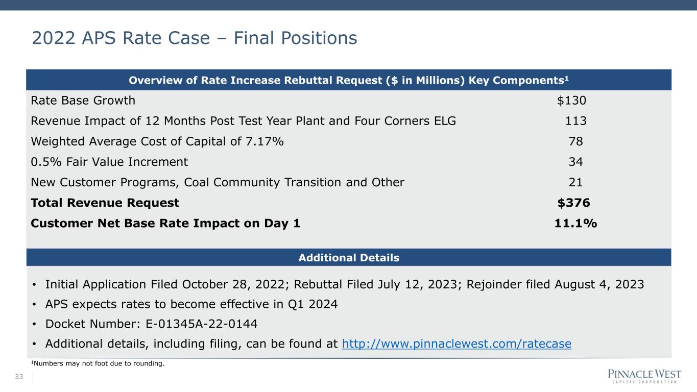 2022 APS Rate Case – Final Positions1 • Eliminate the Environmental Improvement Surcharge and collect costs through base rates • Maintain the Lost Fixed Cost Recovery Mechanism and Demand Side Management Adjustor Charge as separate mechanisms • Adopt a System Reliability Benefit recovery mechanism and maintain REAC in its current state • Modify the performance incentive in the Demand Side Management Adjustor Charge • Increase the Power Supply Adjustor Annual Cap from $0.004/kWh to $0.006/kWh to ensure timely recovery of fuel and purchase power costs • Maintain as inactive the Tax Expense Adjustor Mechanism • Maintain the Transmission Cost Adjustment Mechanism 32 Adjustment Mechanisms Overview • Enhance the current limited income program to include a second tier to provide an additional discount for customers with a greater need New Customer Program Proposals