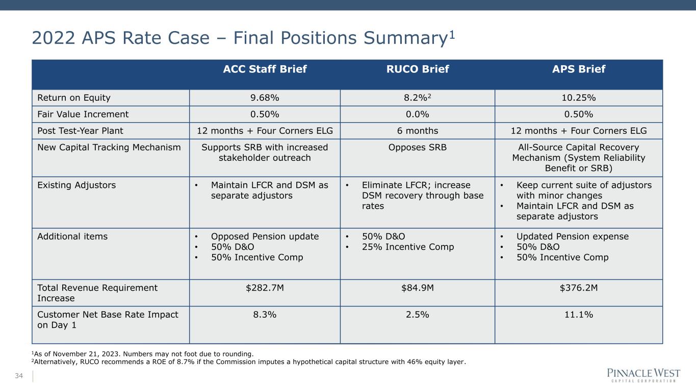 2022 APS Rate Case – Final Positions1 33 Overview of Rate Increase Rebuttal Request ($ in Millions) Key Components1 • Initial Application Filed October 28, 2022; Rebuttal Filed July 12, 2023; Rejoinder filed August 4, 2023 • APS expects rates to become effective in Q1 2024 • Docket Number: E-01345A-22-0144 • Additional details, including filing, can be found at http://www.pinnaclewest.com/ratecase Additional Details Rate Base Growth $130 Revenue Impact of 12 Months Post Test Year Plant and Four Corners ELG 113 Weighted Average Cost of Capital of 7.17% 78 0.5% Fair Value Increment 34 New Customer Programs, Coal Community Transition and Other 21 Total Revenue Request $376 Customer Net Base Rate Impact on Day 1 11.1% 1Numbers may not foot due to rounding.