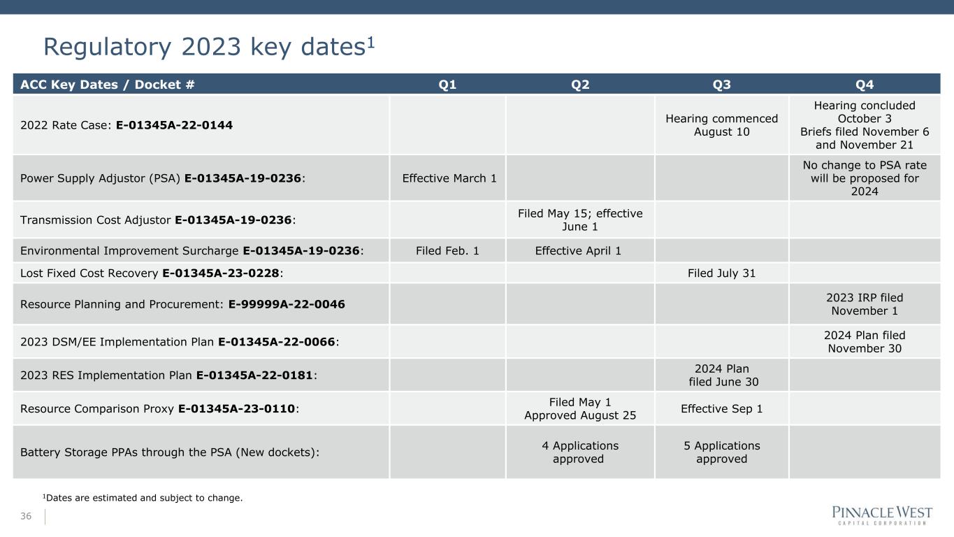 35 Application Filed October 28, 2022 Staff/Intervenor Direct Testimony Due June 5, 2023 Staff/Intervenor Direct Testimony (Rate Design) Due June 15, 2023 APS Rebuttal Testimony Due July 12, 2023 Staff/Intervenor Surrebuttal Testimony Due July 26, 2023 APS Rejoinder Testimony Due August 4, 2023 Pre-Hearing Conference August 7, 2023 Hearing Commenced August 10, 2023 Hearing Concluded October 3, 2023 Briefs Filed November 6 & 21, 2023 Arizona Public Service Company Docket # E-01345A-22-0144 2022 APS Rate Case Procedural Schedule