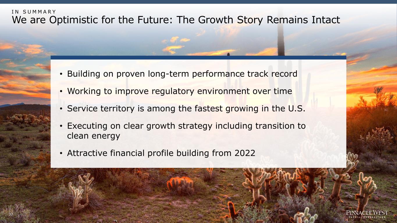 Regulatory 2023 key dates1 36 ACC Key Dates / Docket # Q1 Q2 Q3 Q4 2022 Rate Case: E-01345A-22-0144 Hearing commenced August 10 Hearing concluded October 3 Briefs filed November 6 and November 21 Power Supply Adjustor (PSA) E-01345A-19-0236: Effective March 1 No change to PSA rate will be proposed for 2024 Transmission Cost Adjustor E-01345A-19-0236: Filed May 15; effective June 1 Environmental Improvement Surcharge E-01345A-19-0236: Filed Feb. 1 Effective April 1 Lost Fixed Cost Recovery E-01345A-23-0228: Filed July 31 Resource Planning and Procurement: E-99999A-22-0046 2023 IRP filed November 1 2023 DSM/EE Implementation Plan E-01345A-22-0066: 2024 Plan filed November 30 2023 RES Implementation Plan E-01345A-22-0181: 2024 Plan filed June 30 Resource Comparison Proxy E-01345A-23-0110: Filed May 1 Approved August 25 Effective Sep 1 Battery Storage PPAs through the PSA (New dockets): 4 Applications approved 5 Applications approved 1Dates are estimated and subject to change.