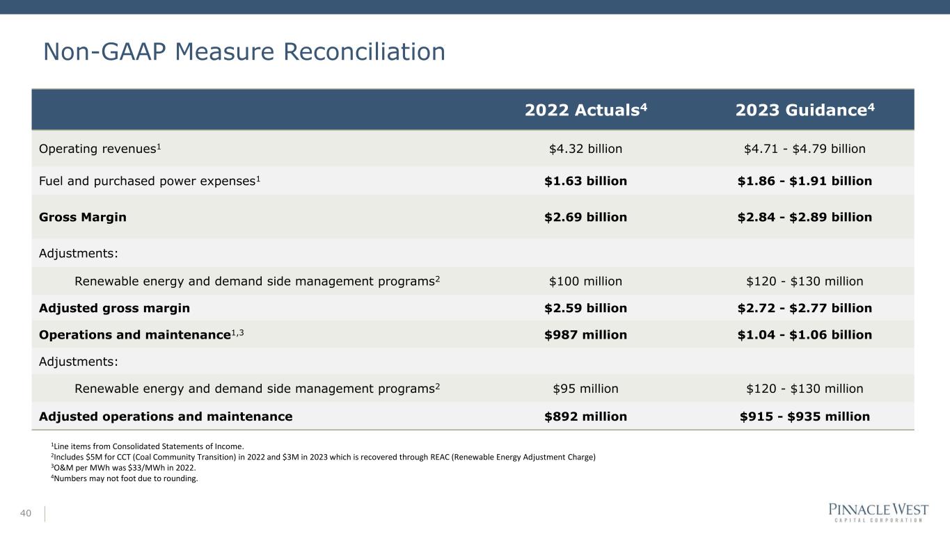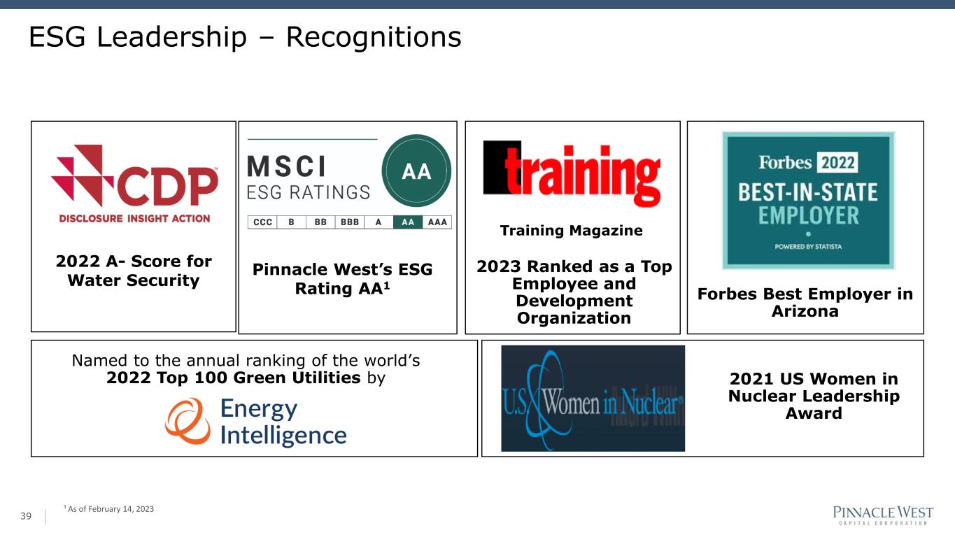 ESG Leadership – Recognitions ¹ As of February 14, 2023 39 Training Magazine 2023 Ranked as a Top Employee and Development Organization 2021 US Women in Nuclear Leadership Award Pinnacle West’s ESG Rating AA1 2022 A- Score for Water Security Forbes Best Employer in Arizona Named to the annual ranking of the world’s 2022 Top 100 Green Utilities by