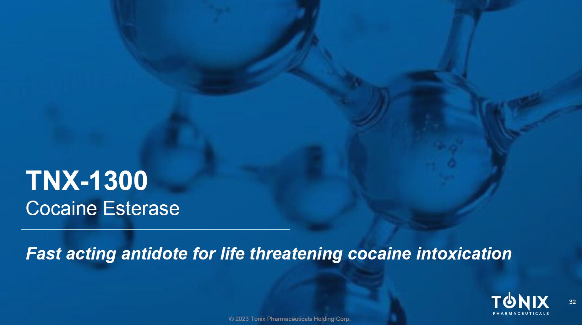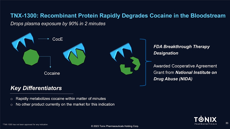 32 © 2023 Tonix Pharmaceuticals Holding Corp. TNX - 1300 Cocaine Esterase Fast acting antidote for life threatening cocaine intoxication