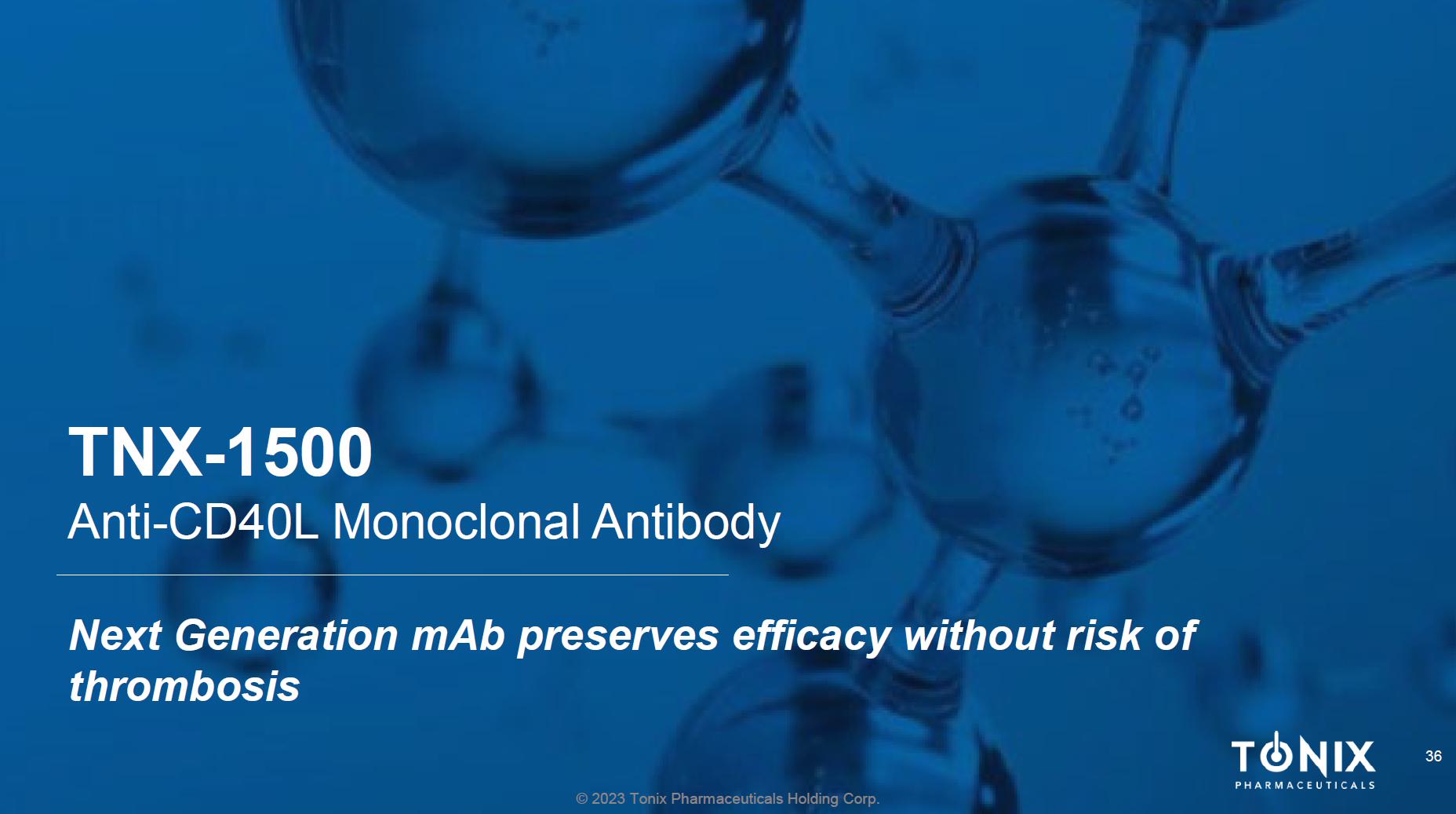 TNX - 1500: Next Generation anti - CD40L mAb 37 Re - engineered to better modulate the binding of Fc R and mitigate risk of thrombosis Key Differentiators © 2023 Tonix Pharmaceuticals Holding Corp. Selectively Modified anti - CD40L AB Ruplizumab full Fab Contains the full ruplizumab Fab and the engineered Fc region that modulates Fc γ R - binding, while preserving FcRn function Mutated Fc γ R - binding region FcRn - binding region Fc γ R - modulated Fc region First Generation: Development halted due to thromboembolic (TE) complications — blood clots — traced to Fc gamma receptor (Fc R) Second Generation: Eliminated the Fc R TE complication but potency and half life was reduced, limiting utility Third Generation (TNX - 1500): Re - engineered to better modulate the binding of Fc R. Expected to deliver efficacy without compromising safety *TNX - 1500 has not been approved for any indication.