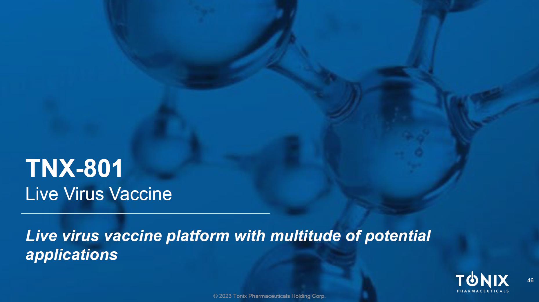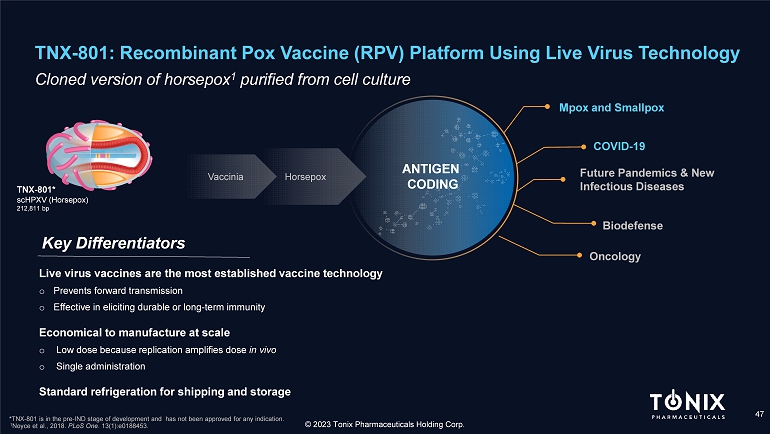 46 © 2023 Tonix Pharmaceuticals Holding Corp. TNX - 801 Live Virus Vaccine Live virus vaccine platform with multitude of potential applications