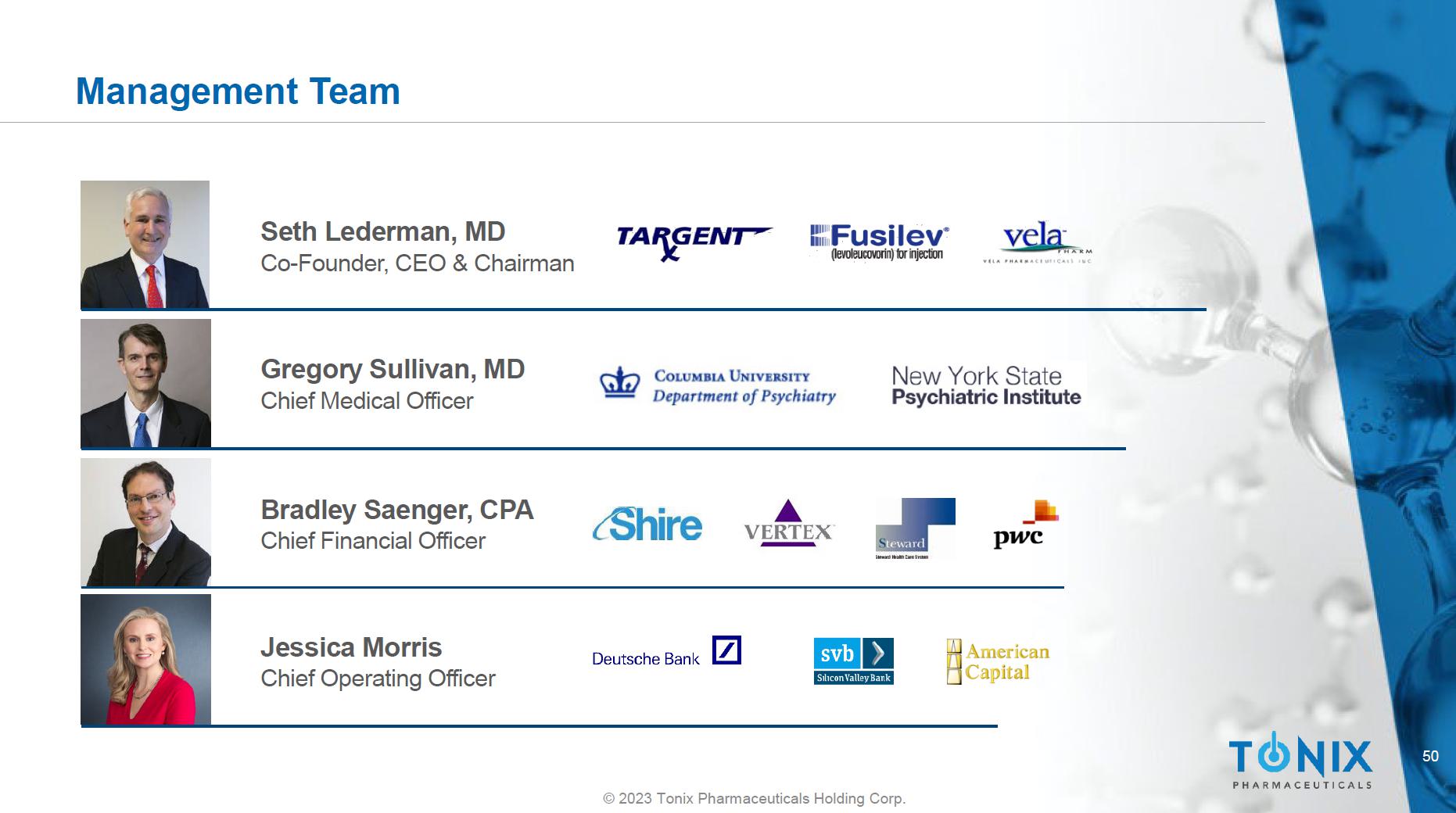 50 © 2023 Tonix Pharmaceuticals Holding Corp. Management Team Seth Lederman, MD Co - Founder, CEO & Chairman Jessica Morris Chief Operating Officer Gregory Sullivan, MD Chief Medical Officer Bradley Saenger, CPA Chief Financial Officer