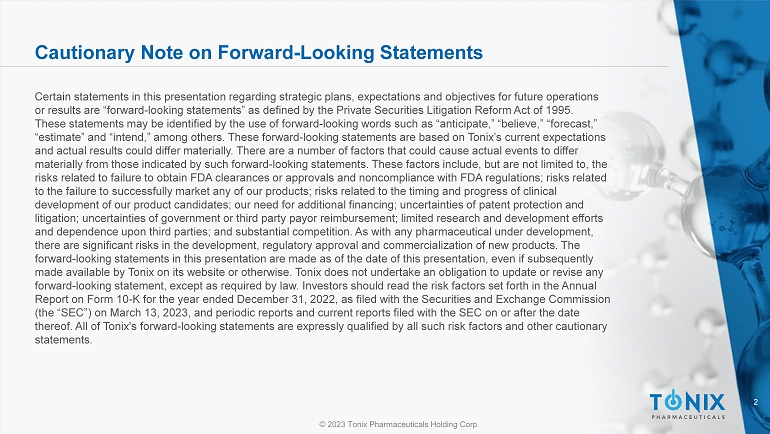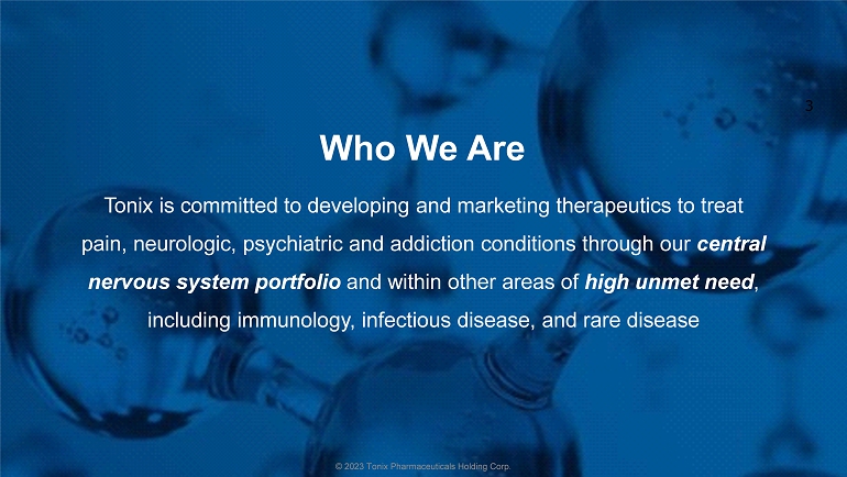 2 © 2023 Tonix Pharmaceuticals Holding Corp. Cautionary Note on Forward - Looking Statements Certain statements in this presentation regarding strategic plans, expectations and objectives for future operations or results are “forward - looking statements” as defined by the Private Securities Litigation Reform Act of 1995. These statements may be identified by the use of forward - looking words such as “anticipate,” “believe,” “forecast,” “estimate” and “intend,” among others. These forward - looking statements are based on Tonix’s current expectations and actual results could differ materially. There are a number of factors that could cause actual events to differ materially from those indicated by such forward - looking statements. These factors include, but are not limited to, the risks related to failure to obtain FDA clearances or approvals and noncompliance with FDA regulations; risks related to the failure to successfully market any of our products; risks related to the timing and progress of clinical development of our product candidates; our need for additional financing; uncertainties of patent protection and litigation; uncertainties of government or third party payor reimbursement; limited research and development efforts and dependence upon third parties; and substantial competition. As with any pharmaceutical under development, there are significant risks in the development, regulatory approval and commercialization of new products. The forward - looking statements in this presentation are made as of the date of this presentation, even if subsequently made available by Tonix on its website or otherwise. Tonix does not undertake an obligation to update or revise any forward - looking statement, except as required by law. Investors should read the risk factors set forth in the Annual Report on Form 10 - K for the year ended December 31, 2022, as filed with the Securities and Exchange Commission (the “SEC”) on March 13, 2023, and periodic reports and current reports filed with the SEC on or after the date thereof. All of Tonix's forward - looking statements are expressly qualified by all such risk factors and other cautionary statements.