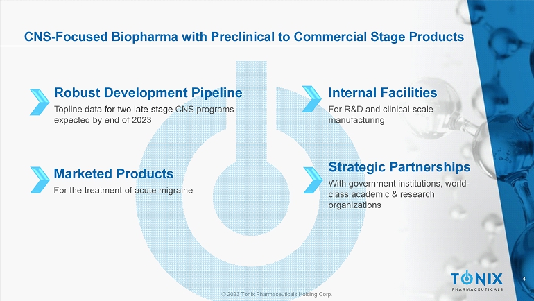© 2023 Tonix Pharmaceuticals Holding Corp. 3 Who We Are Tonix is committed to developing and marketing therapeutics to treat pain, neurologic, psychiatric and addiction conditions through our central nervous system portfolio and within other areas of high unmet need , including immunology, infectious disease, and rare disease