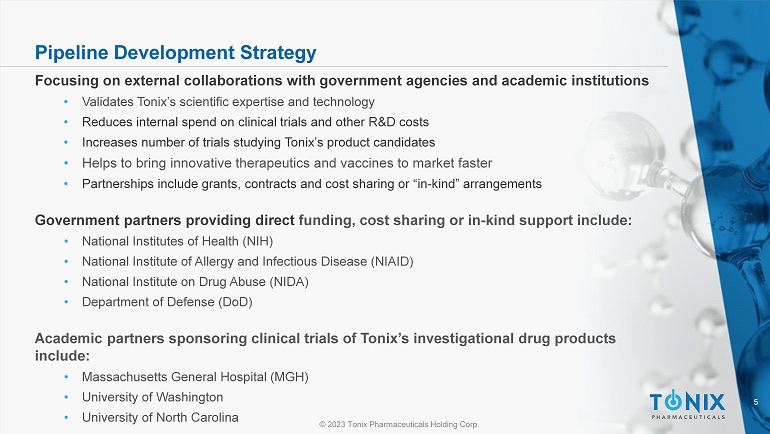 4 © 2023 Tonix Pharmaceuticals Holding Corp. CNS - Focused Biopharma with Preclinical to Commercial Stage Products Marketed Products For the treatment of acute migraine Robust Development Pipeline Topline data for two late - stage CNS programs expected by end of 2023 Internal Facilities For R&D and clinical - scale manufacturing Strategic Partnerships With government institutions, world - class academic & research organizations