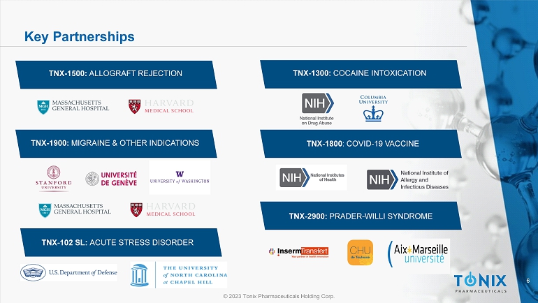 5 © 2023 Tonix Pharmaceuticals Holding Corp. Pipeline Development Strategy Focusing on external collaborations with government agencies and academic institutions • Validates Tonix’s scientific expertise and technology • Reduces internal spend on clinical trials and other R&D costs • Increases number of trials studying Tonix’s product candidates • Helps to bring innovative therapeutics and vaccines to market faster • Partnerships include grants, contracts and cost sharing or “in - kind” arrangements Government partners providing direct funding, cost sharing or in - kind support include: • National Institutes of Health (NIH) • National Institute of Allergy and Infectious Disease (NIAID) • National Institute on Drug Abuse (NIDA) • Department of Defense (DoD) Academic partners sponsoring clinical trials of Tonix’s investigational drug products include: • Massachusetts General Hospital (MGH) • University of Washington • University of North Carolina