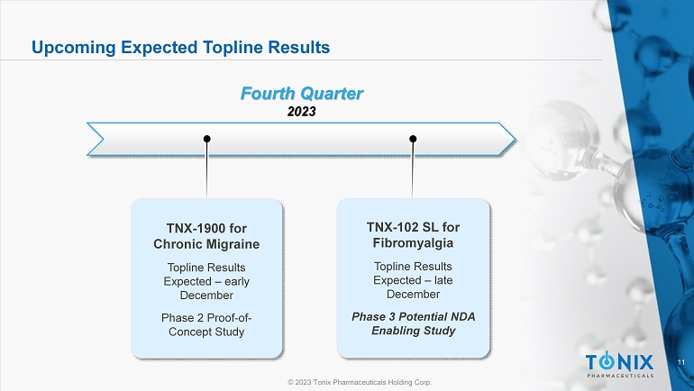Tonix is a biopharmaceutical company focused on commercializing, developing, discovering and licensing therapeutics to treat and prevent human disease and alleviate suffering. Tonix Medicines, our commercial subsidiary, markets Zembrace® SymTouch® (sumatriptan injection) 3 mg and Tosymra® (sumatriptan nasal spray) 10 mg under a transition services agreement with Upsher-Smith Laboratories, LLC from whom the products were acquired on June 30, 2023. Zembrace SymTouch and Tosymra are each indicated for the treatment of acute migraine with or without aura in adults. Tonix’s development portfolio is composed of central nervous system (CNS), rare disease, immunology and infectious disease product candidates. Tonix’s CNS development portfolio includes both small molecules and biologics to treat pain, neurologic, psychiatric and addiction conditions. Tonix’s lead development CNS candidate, TNX-102 SL (cyclobenzaprine HCl sublingual tablet), is in mid-Phase 3 development for the management of fibromyalgia, having completed the clinical phase of a potentially confirmatory Phase 3 study in the fourth quarter of 2023, with topline data expected in late December 2023. TNX-102 SL is also being developed to treat fibromyalgia-type Long COVID, a chronic post-acute COVID-19 condition, and topline results were reported in the third quarter of 2023. TNX-1900 (intranasal potentiated oxytocin), is in development as a preventive treatment in chronic migraine, and enrollment has completed in a Phase 2 proof-of-concept study with topline data expected in early December 2023. TNX-1900 is also being studied in binge eating disorder, pediatric obesity and social anxiety disorder by academic collaborators under investigator-initiated INDs. TNX-1300 (cocaine esterase) is a biologic designed to treat cocaine intoxication and has been granted Breakthrough Therapy designation by the FDA. A Phase 2 study of TNX-1300 is expected to be initiated in the fourth quarter of 2023. Tonix’s rare disease development portfolio includes TNX-2900 (intranasal potentiated oxytocin) for the treatment of Prader-Willi syndrome. TNX-2900 has been granted Orphan Drug designation by the FDA. Tonix’s immunology development portfolio includes biologics to address organ transplant rejection, autoimmunity and cancer, including TNX-1500, which is a humanized monoclonal antibody targeting CD40-ligand (CD40L or CD154) being developed for the prevention of allograft rejection and for the treatment of autoimmune diseases. A Phase 1 study of TNX-1500 was initiated in the third quarter of 2023. Tonix’s infectious disease pipeline includes TNX-801, a vaccine in development to prevent smallpox and mpox. TNX-801 also serves as the live virus vaccine platform or recombinant pox vaccine platform for other infectious diseases, including TNX-1800, in development as a vaccine to protect against COVID-19. During the fourth quarter of 2023, TNX-1800 was selected by the U.S. National Institutes of Health (NIH), National Institute of Allergy and Infectious Diseases (NIAID) Project NextGen for inclusion in Phase 1 clinical trials. The infectious disease development portfolio also includes TNX-3900 and TNX-4000, which are classes of broad-spectrum small molecule oral antivirals.