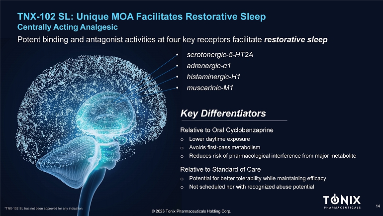 13 © 2023 Tonix Pharmaceuticals Holding Corp. TNX - 102 SL Cyclobenzaprine ( Protectic ® ) A unique, sublingual formulation of cyclobenzaprine designed to optimize delivery and absorption