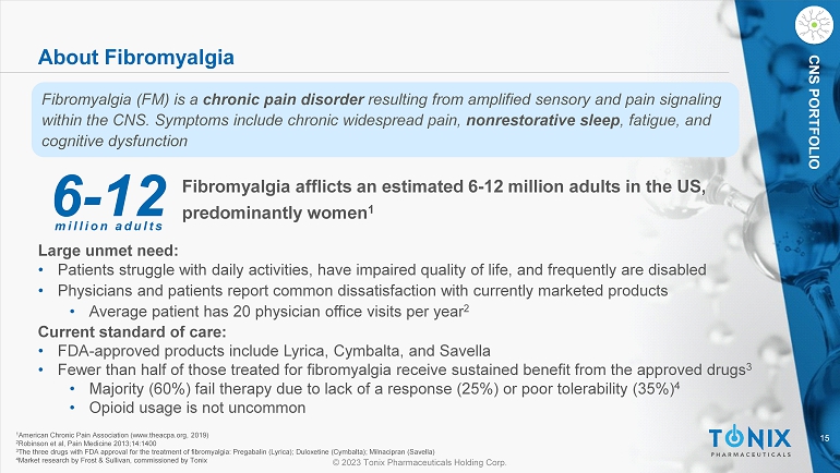 TNX - 102 SL: Unique MOA Facilitates Restorative Sleep Centrally Acting Analgesic 14 Potent binding and antagonist activities at four key receptors facilitate restorative sleep • serotonergic - 5 - HT2A • adrenergic - α1 • histaminergic - H1 • muscarinic - M1 Relative to Oral Cyclobenzaprine o Lower daytime exposure o Avoids first - pass metabolism o Reduces risk of pharmacological interference from major metabolite Relative to Standard of Care o Potential for better tolerability while maintaining efficacy o Not scheduled nor with recognized abuse potential Key Differentiators © 2023 Tonix Pharmaceuticals Holding Corp. *TNX - 102 SL has not been approved for any indication.