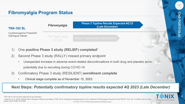 15 © 2023 Tonix Pharmaceuticals Holding Corp. CNS PORTFOLIO CNS PORTFOLIO Fibromyalgia a fflicts an estimated 6 - 12 million adults in the US, predominantly women 1 1 American Chronic Pain Association (www.theacpa.org, 2019) 2 Robinson et al, Pain Medicine 2013;14:1400 3 The three drugs with FDA approval for the treatment of fibromyalgia: Pregabalin (Lyrica); Duloxetine (Cymbalta); Milnacipran ( Savella ) 4 Market research by Frost & Sullivan, commissioned by Tonix About Fibromyalgia Fibromyalgia (FM) is a chronic pain disorder resulting from amplified sensory and pain signaling within the CNS. Symptoms include chronic widespread pain, nonrestorative sleep , fatigue, and cognitive dysfunction 6 - 12 million adults Large unmet need: • Patients struggle with daily activities, have impaired quality of life, and frequently are disabled • Physicians and patients report common dissatisfaction with currently marketed products • Average patient has 20 physician office visits per year 2 Current standard of care: • FDA - approved products include Lyrica, Cymbalta, and Savella • Fewer than half of those treated for fibromyalgia receive sustained benefit from the approved drugs 3 • Majority (60%) fail therapy due to lack of a response (25%) or poor tolerability (35%) 4 • Opioid usage is not uncommon