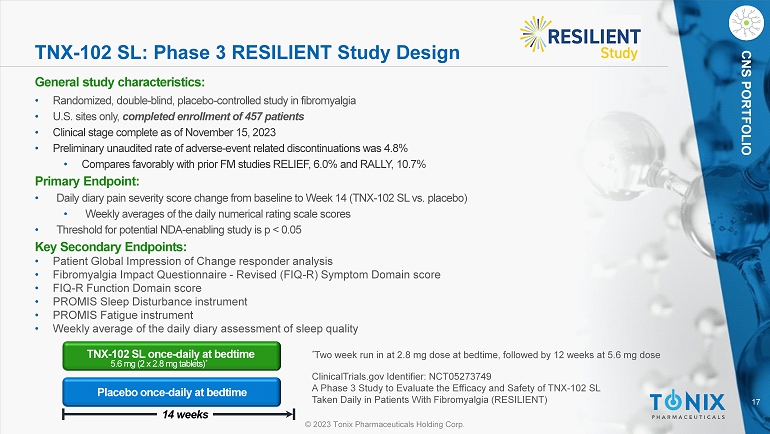 16 © 2023 Tonix Pharmaceuticals Holding Corp. CNS PORTFOLIO Fibromyalgia Program Status Fibromyalgia TNX - 102 SL Cyclobenzaprine Protectic ® Sublingual Tablets FM - Type Long COVID Phase 3 Topline Results Expected 4Q’23 (Late December) Phase 2 Topline Results Reported 3Q’23 1) One positive Phase 3 study (RELIEF) completed 1 2) Second Phase 3 study (RALLY) missed primary endpoint • Unexpected increase in adverse event - related discontinuations in both drug and placebo arms, potentially due to recruiting during COVID - 19 3) Confirmatory Phase 3 study (RESILIENT) enrollment complete • Clinical stage complete as of November 15, 2023 1 Lederman et al., (2023) Arthritis Care & Research "Efficacy and Safety of TNX - 102 SL (Sublingual Cyclobenzaprine) for the Treatment of Fibromyalgia: Results From the RELIEF Trial ", doi : 10.1002/acr.25142. Epub ahead of print. PMID: 37165930. *TNX - 102 SL has not been approved for any indication. Next Steps: Potentially confirmatory t opline results expected 4Q 2023 (Late December)