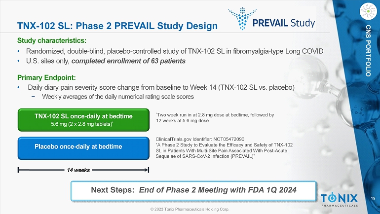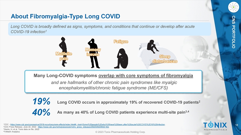 18 © 2023 Tonix Pharmaceuticals Holding Corp. CNS PORTFOLIO About Fibromyalgia - Type Long COVID Many Long - COVID symptoms overlap with core symptoms of fibromyalgia and are hallmarks of other chronic pain syndromes like myalgic encephalomyelitis/chronic fatigue syndrome (ME/CFS) Multisite pain Memory issues Fatigue Sleep disturbances 19% Long COVID occurs in approximately 19% of recovered COVID - 19 patients 2 40 % As many as 40% of Long COVID patients experience multi - site pain 3,4 1 CDC - https://www.cdc.gov/coronavirus/2019 - ncov/long - term - effects/index.html#:~:text=Some%20people%20who%20have%20been,after%20acute%2 0COVID%2D19%20infection . 2 CDC Press Release, June 22, 2022 - https://www.cdc.gov/nchs/pressroom/nchs_press_releases/2022/20220622.htm 3 Harris, H, et al. Tonix data on file. 2022 4 TriNetX Analytics Long COVID is broadly defined as signs, symptoms, and conditions that continue or develop after acute COVID - 19 infection 1