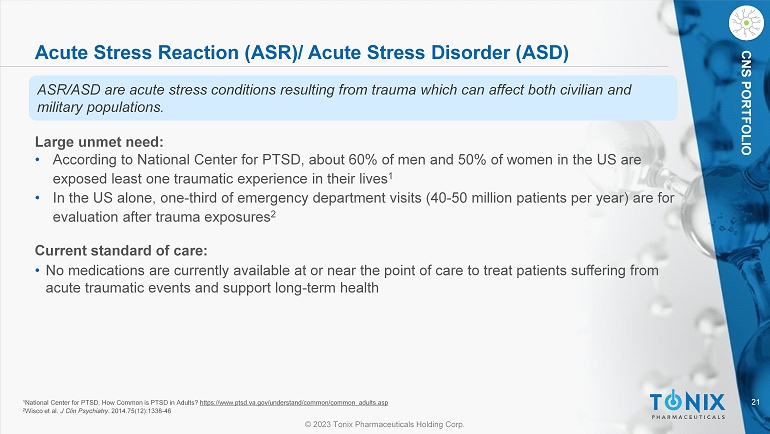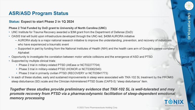 21 © 2023 Tonix Pharmaceuticals Holding Corp. CNS PORTFOLIO CNS PORTFOLIO Acute Stress Reaction (ASR)/ Acute Stress Disorder (ASD) ASR/ASD are acute stress conditions resulting from trauma which c an affect both civilian and military populations. Large unmet need: • According to National Center for PTSD, about 60% of men and 50% of women in the US are exposed least one traumatic experience in their lives 1 • In the US alone, one - third of emergency department visits (40 - 50 million patients per year) are for evaluation after trauma exposures 2 Current standard of care: • No medications are currently available at or near the point of care to treat patients suffering from acute traumatic events and support long - term health 1 National Center for PTSD. How Common is PTSD in Adults? https://www.ptsd.va.gov/understand/common/common_adults.asp 2 Wisco et al. J Clin Psychiatry . 2014.75(12):1338 - 46