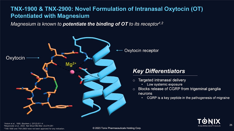 24 © 2023 Tonix Pharmaceuticals Holding Corp. TNX - 1900 and TNX - 2900 Intranasal Potentiated Oxytocin with Magnesium A n ovel, non - CGRP antagonist approach to treatment