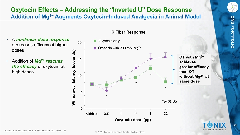 TNX - 1900 & TNX - 2900: Novel Formulation of Intranasal Oxytocin (OT) Potentiated with Magnesium 25 Magnesium is known to potentiate the binding of OT to its receptor 1 ,2 Key Differentiators © 2023 Tonix Pharmaceuticals Holding Corp. Oxytocin receptor Oxytocin o Targeted intranasal delivery • Low systemic exposure o Blocks release of CGRP from trigeminal ganglia neurons • CGRP is a key peptide in the pathogenesis of migraine 1 Antoni et al., 1989. Biochem J . 257(2):611 - 4 2 Meyerowitz et al., 2022. Nat Struct Mol Biol . (3):274 - 281 *TNX - 1900 and TNX - 2900 have not been approved for any indication.
