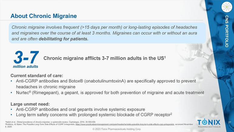 26 © 2023 Tonix Pharmaceuticals Holding Corp. CNS PORTFOLIO 1 Adapted from: Bharadwaj VN, et al. Pharmaceutics . 2022;14(5):1105. Vehicle 0.5 1 4 8 32 0 5 10 15 20 Oxytocin only Oxytocin with 300 mM Mg 2+ * * * * Oxytocin dose (µg) Withdrawal latency (seconds) C Fiber Response 1 * P <0.05 Oxytocin Effects – Addressing the “Inverted U” Dose Response Addition of Mg 2+ Augments Oxytocin - Induced Analgesia in Animal Model • A nonlinear dose response decreases efficacy at higher doses • Addition of Mg 2+ rescues the efficacy of oxytocin at high doses OT with Mg 2+ achieves greater efficacy than OT without Mg 2+ at same dose
