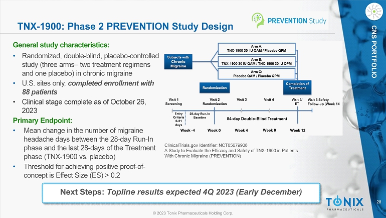 27 © 2023 Tonix Pharmaceuticals Holding Corp. CNS PORTFOLIO CNS PORTFOLIO Chronic migraine afflicts 3 - 7 million adults in the US 1 About Chronic Migraine Chronic migraine involves frequent (>15 days per month) or long - lasting episodes of headaches and migraines over the course of at least 3 months. Migraines can occur with or without an aura and are often debilitating for patients. 3 - 7 million adults 1 Natoli et al., Global prevalence of chronic migraine: a systematic review, Cephalagia , 2010, 30:599 - 609 2 Robbins, At Stake: The Possible Long - Term Side Effects of CGRP Antagonists, https://www.practicalpainmanagement.com/pain/headache/stake - possible - long - term - side - effects - cgrp - antagonists , accessed November 8, 2020. Current standard of care: • Anti - CGRP antibodies and Botox® ( onabotulinumtoxinA ) are specifically approved to prevent headaches in chronic migraine • Nurtec ® (Rimegepant), a gepant , is approved for both prevention of migraine and acute treatment Large unmet need: • Anti - CGRP antibodies and oral gepants involve systemic exposure • Long term safety concerns with prolonged systemic blockade of CGRP receptor 2