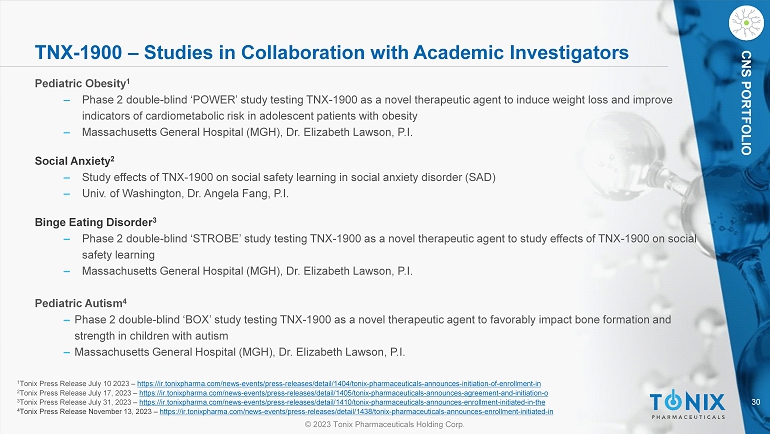 29 © 2023 Tonix Pharmaceuticals Holding Corp. Potential Applications of TNX - 1900 & TNX - 2900: Investigator Led Studies Adolescent Obesity Binge Eating Dis. Eating Behavior and Weight Disorders Autism Social Functioning Disorders Social Anxiety Disorder Migraine Cranio - facial Pain Pain Conditions Phase 2 Study in Prevention of Headache in Chronic Migraine • Topline results expected 4Q 2023 Phase 2 Study Enrolling • Investigator - Initiated IND Phase 2 Study Enrolling • Investigator - Initiated IND Phase Study 2 Planned • IND Cleared for Phase 2 • Orphan Drug Designation Awarded Phase 2 Study initiated • Investigator - Initiated IND PWS* *Prader - Willi Syndrome Phase 2 Study initiated • Investigator - Initiated IND