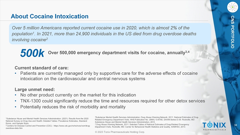 TNX - 1300: Recombinant Protein Rapidly Degrades Cocaine in the Bloodstream 33 Drops plasma exposure by 90% in 2 minutes Key Differentiators © 2023 Tonix Pharmaceuticals Holding Corp. o Rapidly metabolizes cocaine within matter of minutes o N o other product currently on the market for this indication CocE Cocaine FDA Breakthrough Therapy Designation Awarded Cooperative Agreement Grant from National Institute on Drug Abuse (NIDA) *TNX - 1300 has not been approved for any indication.