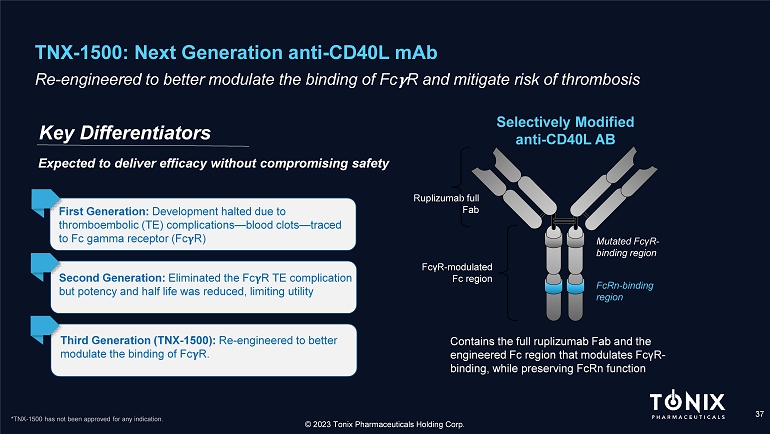 36 © 2023 Tonix Pharmaceuticals Holding Corp. TNX - 1500 Anti - CD40L Monoclonal Antibody Next Generation mAb preserves efficacy without risk of thrombosis