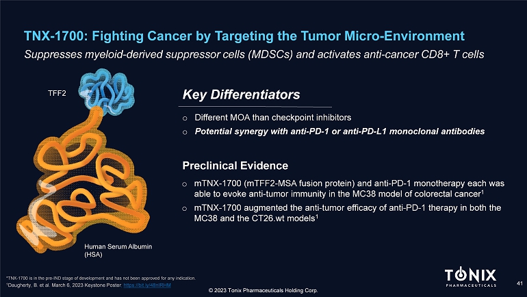 40 © 2023 Tonix Pharmaceuticals Holding Corp. TNX - 1700 Recombinant Trefoil Factor Family Member 2 (rTFF2 - HSA) Fusion Protein Targeting the toxic tumor micro - environment