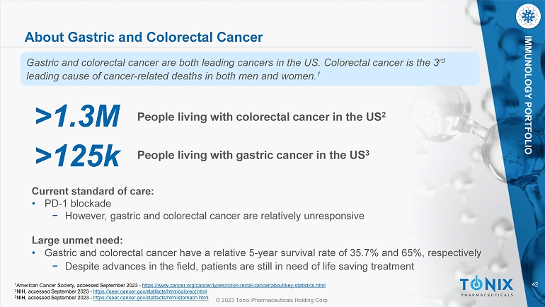 42 © 2023 Tonix Pharmaceuticals Holding Corp. IMMUNOLOGY PORTFOLIO People living with colorectal cancer in the US 2 About Gastric and Colorectal Cancer Gastric and colorectal cancer are both leading cancers in the US. C olorectal cancer is the 3 rd leading cause of cancer - related deaths in both men and women. 1 >1.3M Current standard of care: • PD - 1 blockade − However, gastric and colorectal cancer are relatively unresponsive Large unmet need: • Gastric and colorectal cancer have a relative 5 - year survival rate of 35.7% and 65%, respectively − Despite advances in the field, patients are still in need of life saving treatment 1 American Cancer Society, accessed September 2023 - https://www.cancer.org/cancer/types/colon - rectal - cancer/about/key - statistics.html 2 NIH, accessed September 2023 - https://seer.cancer.gov/statfacts/html/colorect.html 3 NIH, accessed September 2023 - https://seer.cancer.gov/statfacts/html/stomach.html >125k People living with gastric cancer in the US 3