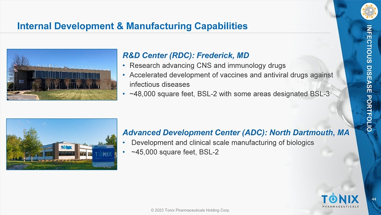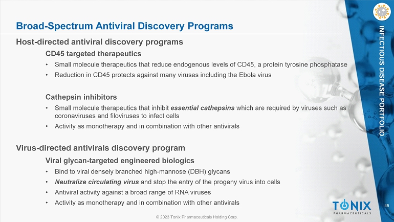 44 © 2023 Tonix Pharmaceuticals Holding Corp. INFECTIOUS DISEASE PORTFOLIO Internal Development & Manufacturing Capabilities R&D Center (RDC): Frederick, MD • Research advancing CNS and immunology drugs • Accelerated development of vaccines and antiviral drugs against infectious diseases • ~48,000 square feet, BSL - 2 with some areas designated BSL - 3 Advanced Development Center (ADC): North Dartmouth, MA • Development and clinical scale manufacturing of biologics • ~45,000 square feet, BSL - 2