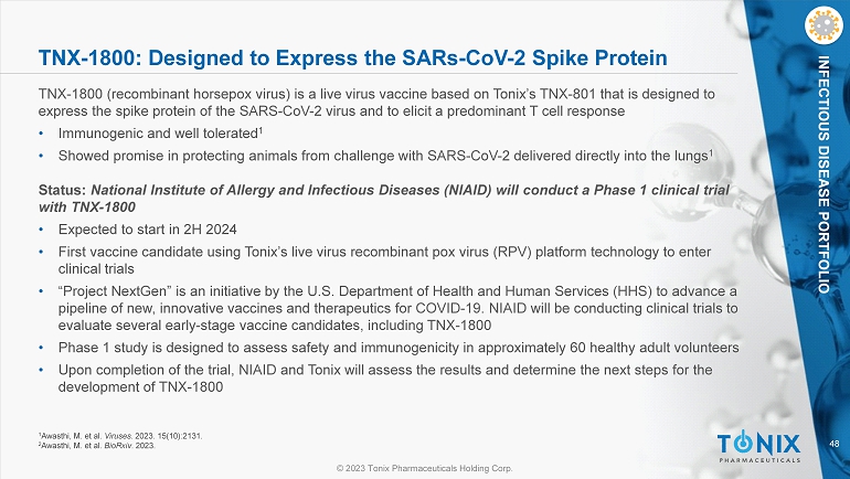 TNX - 801: Recombinant Pox Vaccine (RPV) Platform Using Live Virus Technology 47 C loned version of horsepox 1 purified from cell culture Key Differentiators © 2023 Tonix Pharmaceuticals Holding Corp. TNX - 801* scHPXV (Horsepox) 212,811 bp *TNX - 801 is in the pre - IND stage of development and has not been approved for any indication. 1 Noyce et al., 2018. PLoS One . 13(1):e0188453. Live virus vaccines are the most established vaccine technology o Prevents forward transmission o Effective in eliciting durable or long - term immunity Economical to manufacture at scale o Low dose because replication amplifies dose in vivo o Single administration Standard refrigeration for shipping and storage Mpox and Smallpox Future Pandemics & New Infectious Diseases COVID - 19 Biodefense Vaccinia Horsepox Oncology ANTIGEN CODING