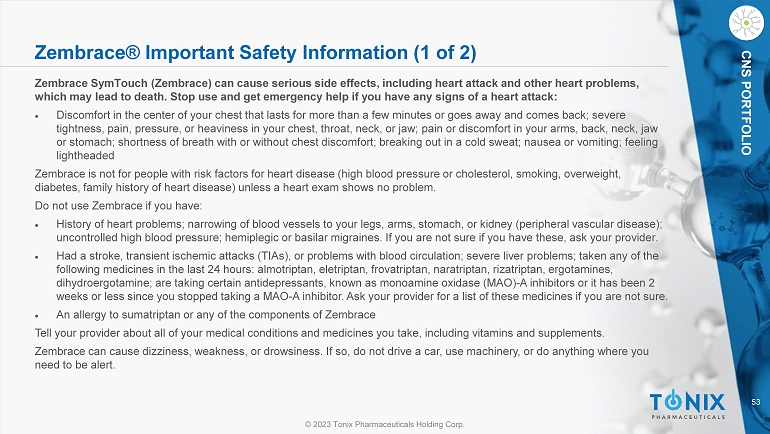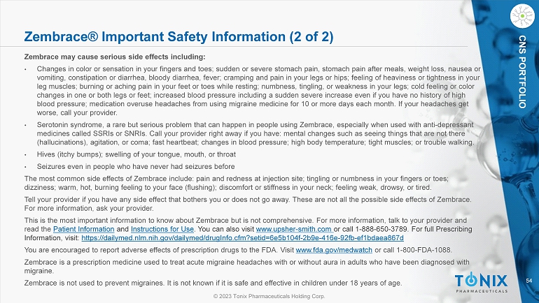 53 © 2023 Tonix Pharmaceuticals Holding Corp. CNS PORTFOLIO Zembrace ® Important Safety Information (1 of 2) Zembrace SymTouch ( Zembrace ) can cause serious side effects, including heart attack and other heart problems, which may lead to death. Stop use and get emergency help if you have any signs of a heart attack: D iscomfort in the center of your chest that lasts for more than a few minutes or goes away and comes back; severe tightness, pain, pressure, or heaviness in your chest, throat, neck, or jaw; pain or discomfort in your arms, back, neck, jaw or stomach ; shortness of breath with or without chest discomfort ; breaking out in a cold sweat ; nausea or vomiting ; feeling lightheaded Zembrace is not for people with risk factors for heart disease (high blood pressure or cholesterol, smoking, overweight, diabetes, family history of heart disease) unless a heart exam shows no problem. Do not use Zembrace if you have: H istory of heart problems ; narrowing of blood vessels to your legs, arms, stomach, or kidney (peripheral vascular disease) ; uncontrolled high blood pressure ; hemiplegic or basilar migraines. If you are not sure if you have these, ask your provider. H ad a stroke, transient ischemic attacks (TIAs), or problems with blood circulation ; severe liver problems ; taken any of the following medicines in the last 24 hours: almotriptan , eletriptan , frovatriptan , naratriptan, rizatriptan, ergotamines , dihydroergotamine ; are taking certain antidepressants, known as monoamine oxidase (MAO) - A inhibitors or it has been 2 weeks or less since you stopped taking a MAO - A inhibitor. Ask your provider for a list of these medicines if you are not sure. A n allergy to sumatriptan or any of the components of Zembrace Tell your provider about all of your medical conditions and medicines you take, including vitamins and supplements. Zembrace can cause dizziness, weakness, or drowsiness. If so, do not drive a car, use machinery, or do anything where you need to be alert.