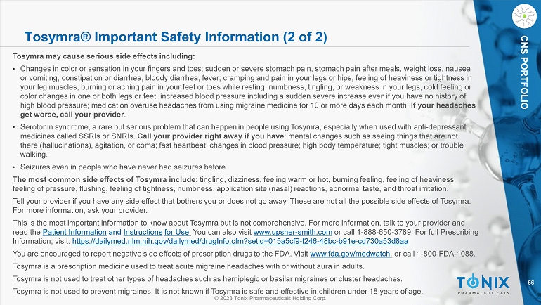 55 © 2023 Tonix Pharmaceuticals Holding Corp. CNS PORTFOLIO Tosymra® Important Safety Information (1 of 2) Tosymra® can cause serious side effects, including heart attack and other heart problems, which may lead to death. Stop Tosymra and get emergency medical help if you have any signs of heart attack: • D iscomfort in the center of your chest that lasts for more than a few minutes or goes away and comes back ; severe tightness, pain, pressure, or heaviness in your chest, throat, neck, or jaw ; pain or discomfort in your arms, back, neck, jaw, or stomach ; shortness of breath with or without chest discomfort; breaking out in a cold sweat ; nausea or vomiting ; feeling lightheaded Tosymra is not for people with risk factors for heart disease (high blood pressure or cholesterol, smoking, overweight, diabetes, family history of heart disease) unless a heart exam is done and shows no problem. Do not use Tosymra if you have: • H istory of heart problems ; narrowing of blood vessels to your legs, arms, stomach, or kidney (peripheral vascular disease) ; uncontrolled high blood pressure ; severe liver problems ; hemiplegic or basilar migraines. If you are not sure if you have these, ask your healthcare provider. • H ad a stroke, transient ischemic attacks (TIAs), or problems with blood circulation ; taken any of the following medicines in the last 24 hours: almotriptan , eletriptan , frovatriptan , naratriptan, rizatriptan, ergotamines , or dihydroergotamine. Ask your provider if you are not sure if your medicine is listed above • are taking certain antidepressants, known as monoamine oxidase (MAO) - A inhibitors or it has been 2 weeks or less since you stopped taking a MAO - A inhibitor . A sk your provider for a list of these medicines if you are not sure • A n allergy to sumatriptan or any ingredient in Tosymra Tell your provider about all of your medical conditions and medicines you take, including vitamins and supplements. Tosymra can cause dizziness, weakness, or drowsiness. If so, do not drive a car, use machinery, or do anything where you need to be alert.