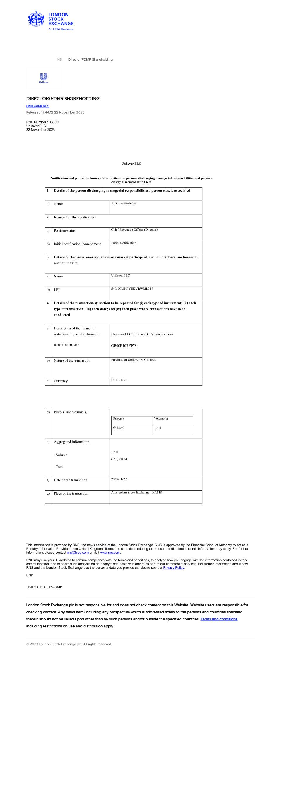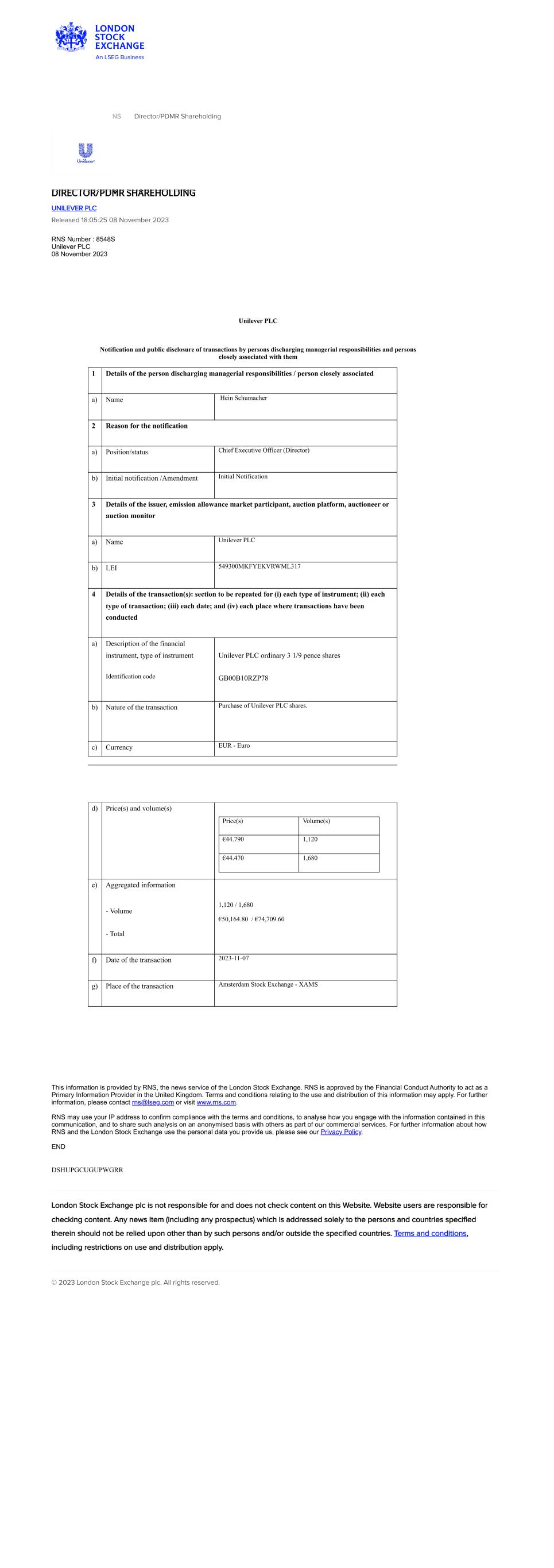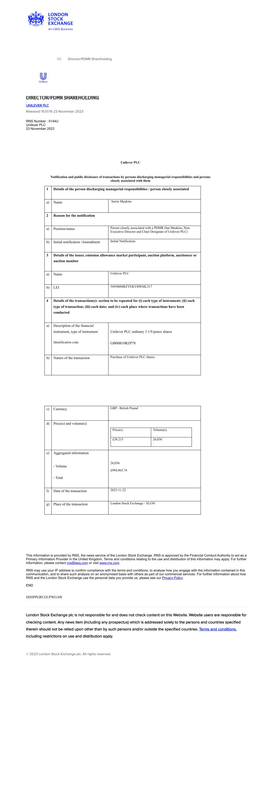 | UNILEVER PLC |