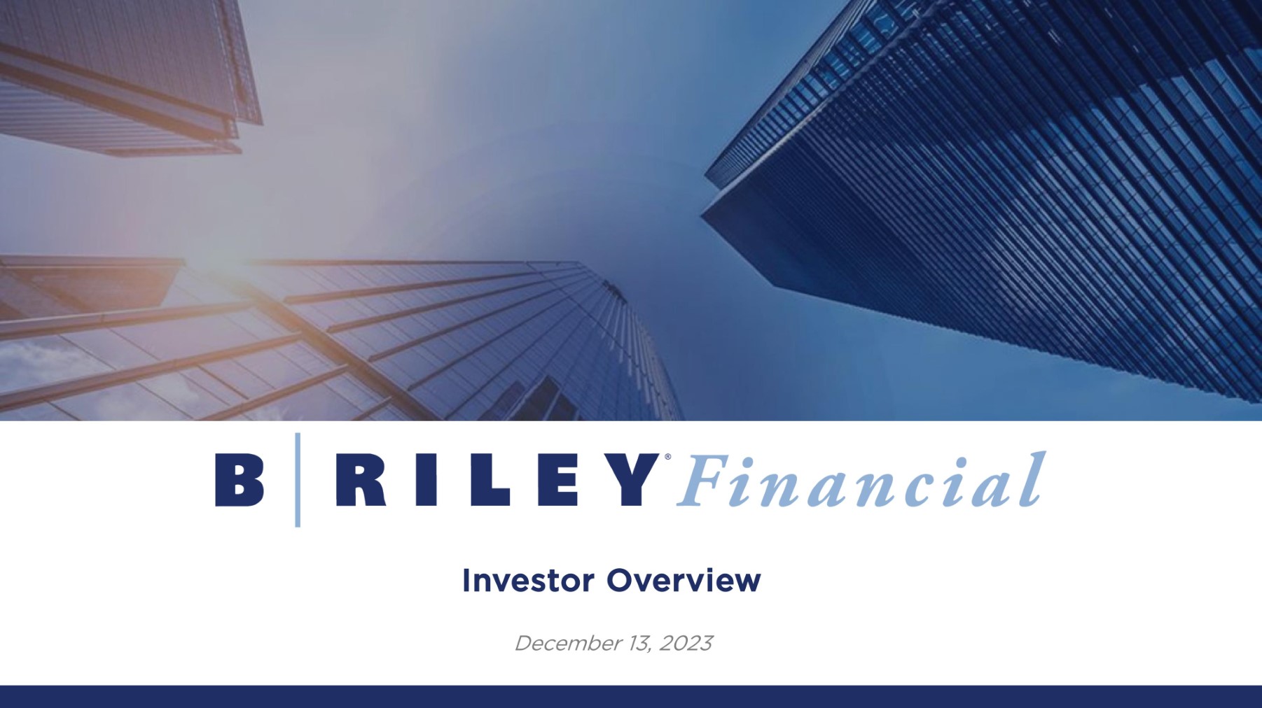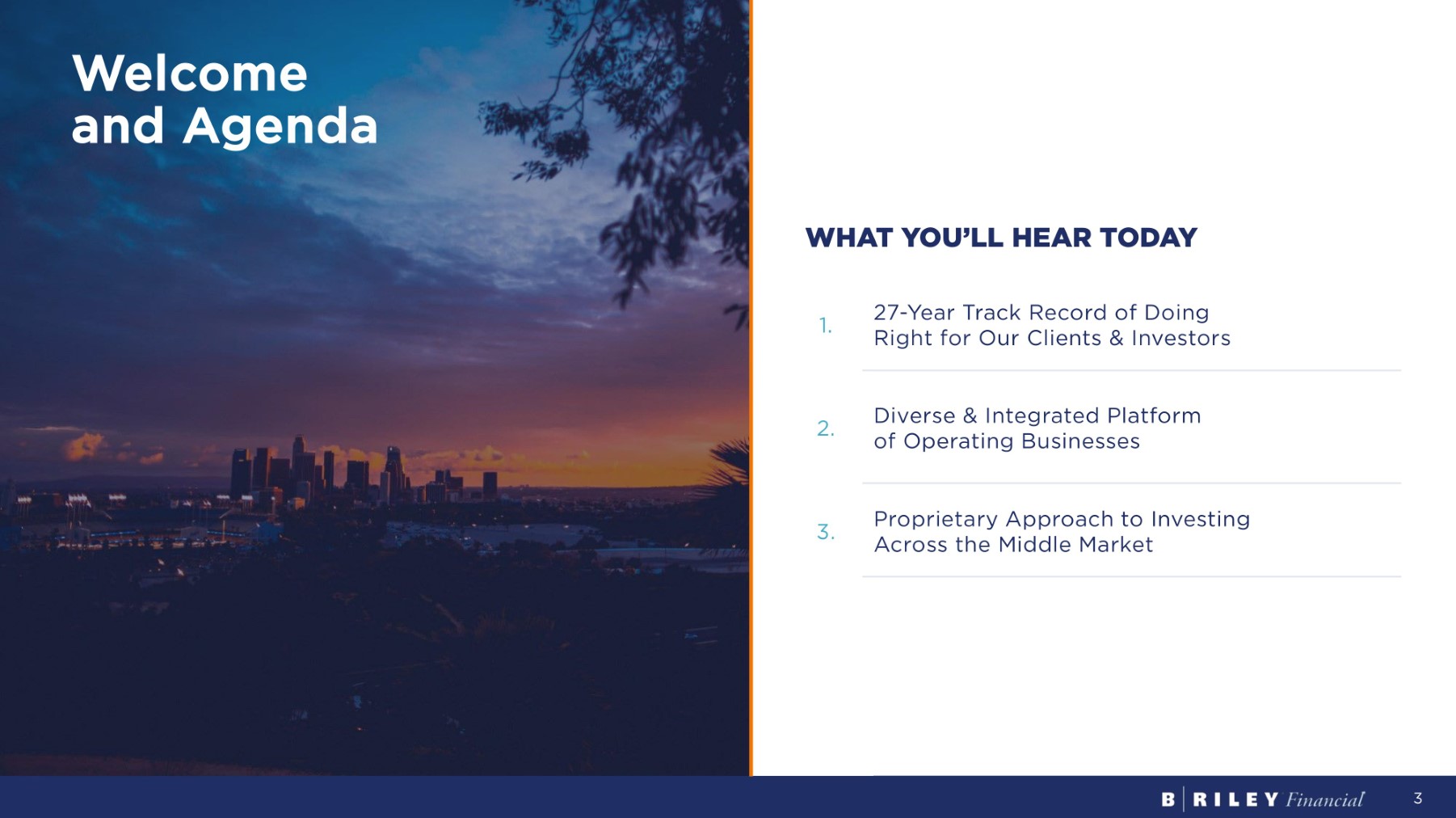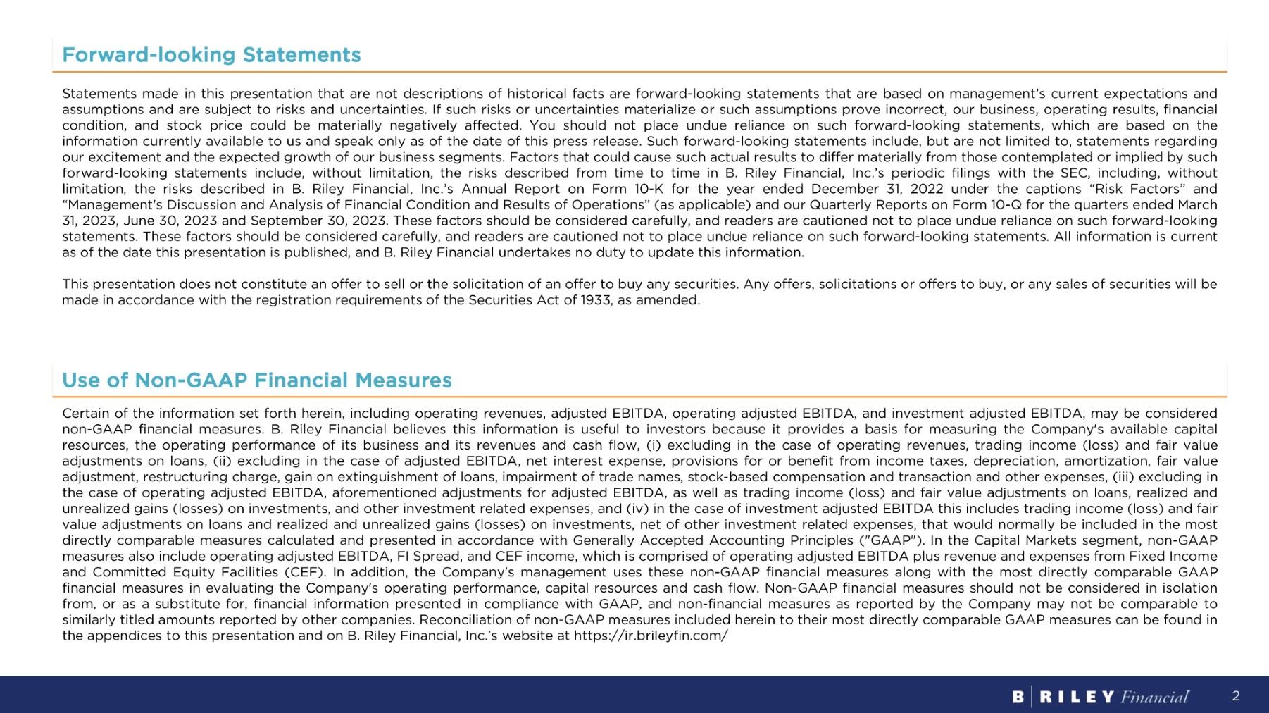 Forward - looking Statements Statements made in this presentation that are not descriptions of historical facts are forward - looking statements that are based on management’s current expectations and assumptions and are subject to risks and uncertainties . If such risks or uncertainties materialize or such assumptions prove incorrect, our business, operating results, financial condition, and stock price could be materially negatively affected . You should not place undue reliance on such forward - looking statements, which are based on the information currently available to us and speak only as of the date of this press release . Such forward - looking statements include, but are not limited to, statements regarding our excitement and the expected growth of our business segments . Factors that could cause such actual results to differ materially from those contemplated or implied by such forward - looking statements include, without limitation, the risks described from time to time in B . Riley Financial, Inc . ’s periodic filings with the SEC, including, without limitation, the risks described in B . Riley Financial, Inc . ’s Annual Report on Form 10 - K for the year ended December 31 , 2022 under the captions “Risk Factors” and “Management's Discussion and Analysis of Financial Condition and Results of Operations” (as applicable) and our Quarterly Reports on Form 10 - Q for the quarters ended March 31 , 2023 , June 30 , 2023 and September 30 , 2023 . These factors should be considered carefully, and readers are cautioned not to place undue reliance on such forward - looking statements . These factors should be considered carefully, and readers are cautioned not to place undue reliance on such forward - looking statements . All information is current as of the date this presentation is published, and B . Riley Financial undertakes no duty to update this information . This presentation does not constitute an offer to sell or the solicitation of an offer to buy any securities . Any offers, solicitations or offers to buy, or any sales of securities will be made in accordance with the registration requirements of the Securities Act of 1933 , as amended . Use of Non - GAAP Financial Measures 2 Certain of the information set forth herein, including operating revenues, adjusted EBITDA, operating adjusted EBITDA, and investment adjusted EBITDA, may be considered non - GAAP financial measures . B . Riley Financial believes this information is useful to investors because it provides a basis for measuring the Company's available capital resources, the operating performance of its business and its revenues and cash flow, (i) excluding in the case of operating revenues, trading income (loss) and fair value adjustments on loans, (ii) excluding in the case of adjusted EBITDA, net interest expense, provisions for or benefit from income taxes, depreciation, amortization, fair value adjustment, restructuring charge, gain on extinguishment of loans, impairment of trade names, stock - based compensation and transaction and other expenses, (iii) excluding in the case of operating adjusted EBITDA, aforementioned adjustments for adjusted EBITDA, as well as trading income (loss) and fair value adjustments on loans, realized and unrealized gains (losses) on investments, and other investment related expenses, and (iv) in the case of investment adjusted EBITDA this includes trading income (loss) and fair value adjustments on loans and realized and unrealized gains (losses) on investments, net of other investment related expenses, that would normally be included in the most directly comparable measures calculated and presented in accordance with Generally Accepted Accounting Principles ("GAAP") . In the Capital Markets segment, non - GAAP measures also include operating adjusted EBITDA, FI Spread, and CEF income, which is comprised of operating adjusted EBITDA plus revenue and expenses from Fixed Income and Committed Equity Facilities (CEF) . In addition, the Company's management uses these non - GAAP financial measures along with the most directly comparable GAAP financial measures in evaluating the Company's operating performance, capital resources and cash flow . Non - GAAP financial measures should not be considered in isolation from, or as a substitute for, financial information presented in compliance with GAAP, and non - financial measures as reported by the Company may not be comparable to similarly titled amounts reported by other companies . Reconciliation of non - GAAP measures included herein to their most directly comparable GAAP measures can be found in the appendices to this presentation and on B . Riley Financial, Inc . ’s website at https : //ir . brileyfin . com/