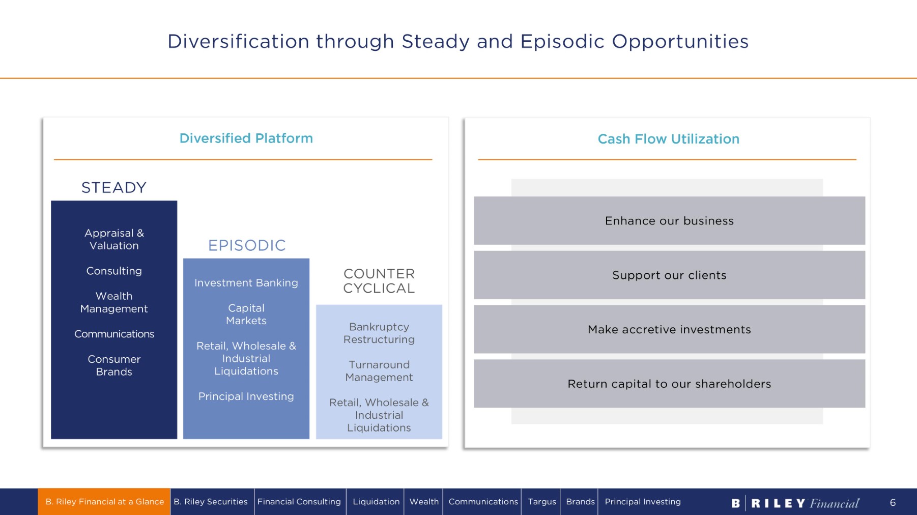 Bryant Riley Co - founder, Chairman, Co - CEO, B. Riley Financial Tom Kelleher C o - f oun d e r , C o - C E O , B. Riley Financial Phil Ahn CFO and COO, B. Riley Financial Legacy Great American Group since 2010 Dan Shribman CIO, B. Riley Financial since 2019 President, Principal Investments since 2018 Andy Moore CEO, B. Riley Securities Legacy B. Riley & Co. since 2006 Jimmy Baker President, B. Riley Securities Legacy B. Riley & Co. since 2010 Ian Ratner Co - CEO, Advisory Services Legacy GlassRatner since 2001 Mike Marchlik Co - CEO, Advisory Services Legacy Great American Appraisal since 1996 Mikel Williams CEO, Targus since 2016 Former director BRF 2015 - 2022 Former CEO, DDi Corp. 2005 - 2012 Nick Capuano CIO, Principal Investments (brands) since 2009 Kenny Young President, B. Riley Financial CEO, Principal Investments since 2016 CEO, Babcock & Wilcox since 2018 Former BRF director from 2015 - 2016 CEO, LCC 2008 - 2015 Ananth Veluppillai COO, Principal Investments (communications) since 2016 Michael Mullen CEO, B. Riley Wealth Legacy National Holdings since 2008 Scott Carpenter CEO, Retail, Wholesale & Industrial Solutions Legacy Great American Group since 1997 Chuck Hastings Chairman, B. Riley Wealth Legacy B. Riley & Co. since 2013 Alan Forman EVP & General Counsel since 2015 Long - Tenured Leadership Michael Jerbich President, B. Riley Real Estate since 2020 Tim Shilling EVP, Retail, Wholesale & Industrial Solutions since 2021 B. Riley Financial at a Glance B. Riley Securities Financial Consulting Liquidation Wealth Communications Targus Brands Principal Investing 5
