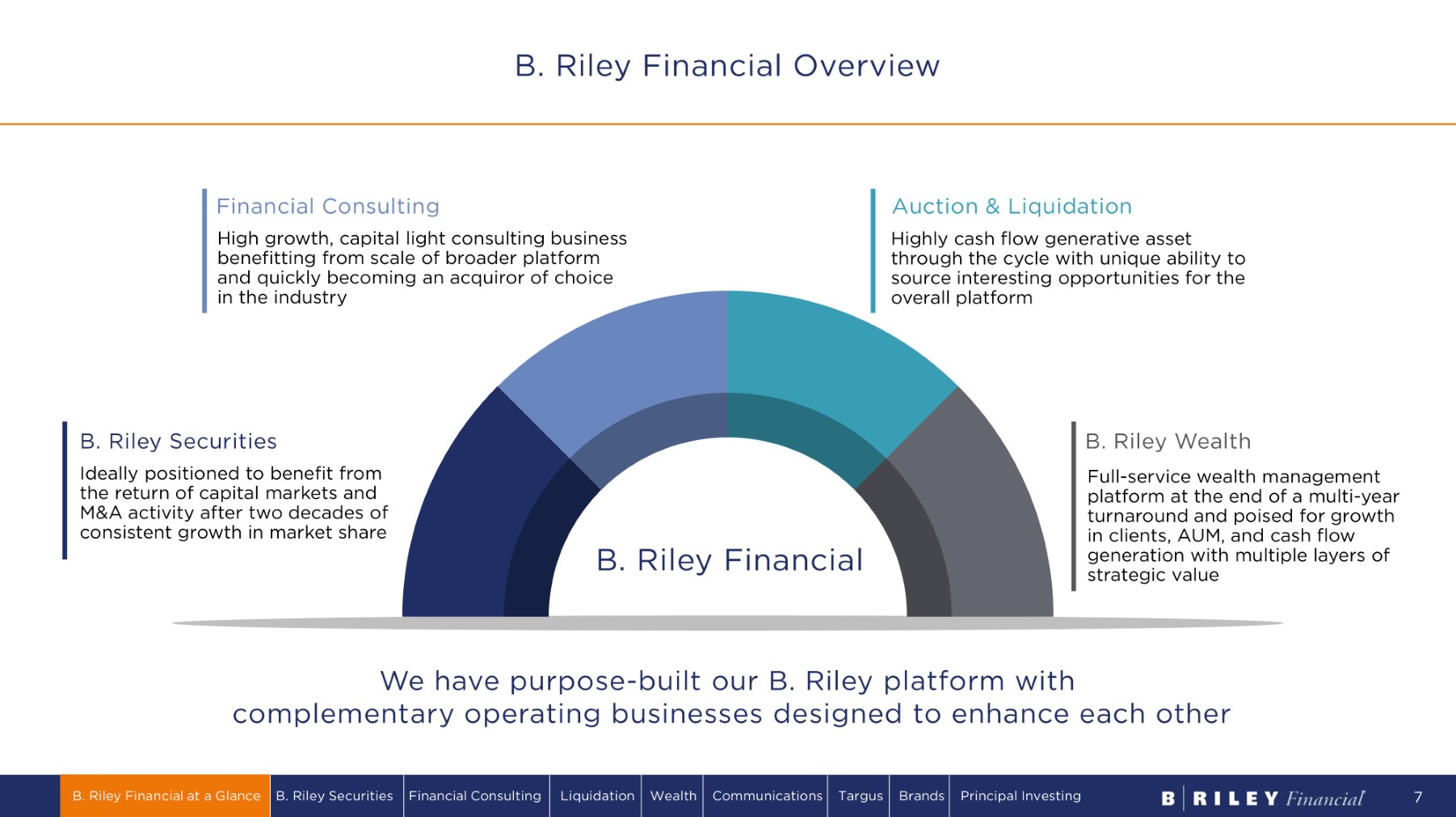 Diversification through Steady and Episodic Opportunities Diversified Platform S TEA D Y EPISODIC C O U N T E R C Y CL I CA L Appraisal & Valuation C o n s u lti n g Wealth M a n a g emen t Investment Banking Capital M ark e t s Communications Retail, Wholesale & Consumer Industrial Brands Liquidations Principal Investing Bankruptcy R e s tr u c t u r i n g Turnaround M a n a g emen t Retail, Wholesale & Industrial Liquidations Support our clients Make accretive investments Cash Flow Utilization Enhance our business Return capital to our shareholders B. Riley Financial at a Glance B. Riley Securities Financial Consulting Liquidation Wealth Communications Targus Brands Principal Investing 6