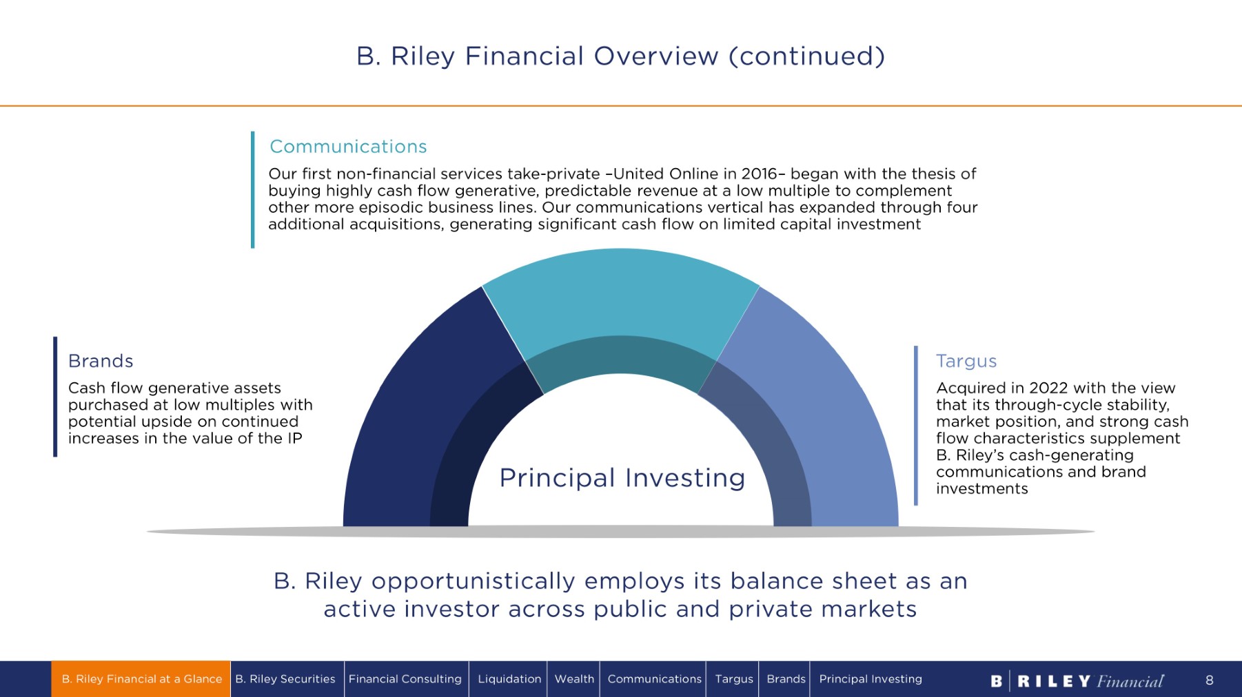 B. Riley Financial Overview We have purpose - built our B. Riley platform with complementary operating businesses designed to enhance each other B. Riley Wealth Full - service wealth management platform at the end of a multi - year turnaround and poised for growth in clients, AUM, and cash flow generation with multiple layers of strategic value B. Riley Securities Ideally positioned to benefit from the return of capital markets and M&A activity after two decades of consistent growth in market share Financial Consulting High growth, capital light consulting business benefitting from scale of broader platform and quickly becoming an acquiror of choice in the industry B. Riley Financial Auction & Liquidation Highly cash flow generative asset through the cycle with unique ability to source interesting opportunities for the overall platform B. Riley Financial at a Glance B. Riley Securities Financial Consulting Liquidation Wealth Communications Targus Brands Principal Investing 7