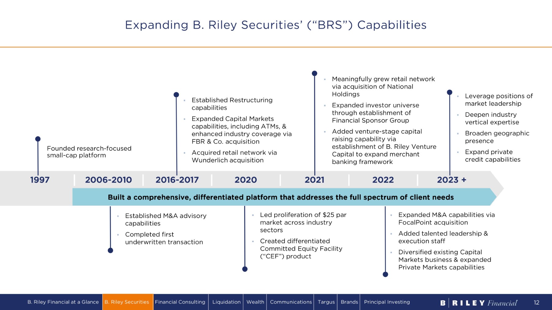 Advisory Purpose - built to help our clients outperform throughout market cycles M&A Representation Private Markets Advisory Restructuring Advisory Brokerage B. Riley Financial at a Glance B. Riley Securities Financial Consulting Liquidation Wealth Communications Targus Brands Principal Investing 11 Institutional Sales & Trading Research Corporate Access Securities Lending Capital Markets Equity Capital Markets Debt Capital Markets