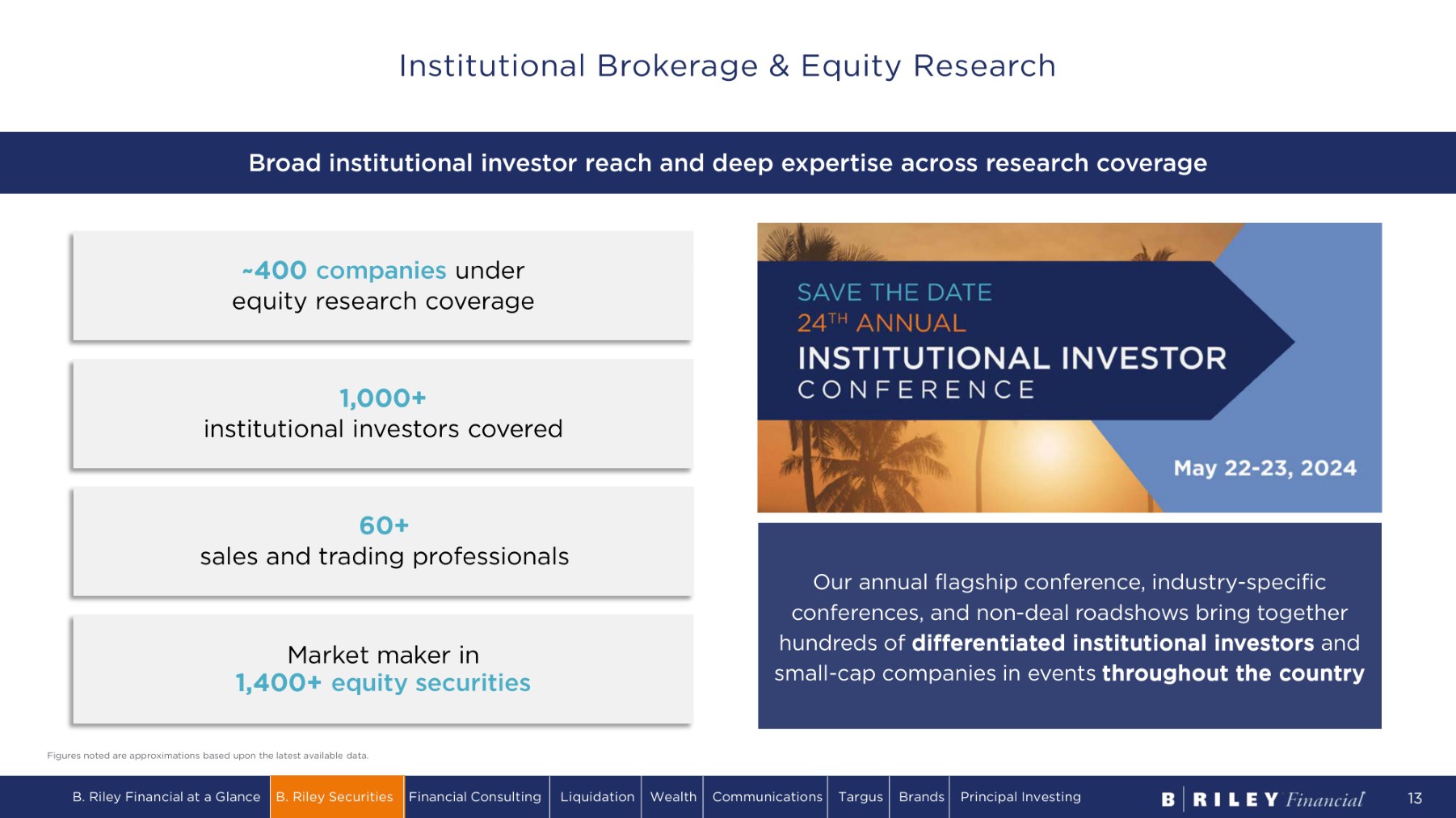 Expanding B. Riley Securities’ (“BRS”) Capabilities ▪ Established M&A advisory capabilities ▪ Completed first underwritten transaction ▪ Meaningfully grew retail network via acquisition of National Holdings ▪ Expanded investor universe through establishment of Financial Sponsor Group ▪ Added venture - stage capital raising capability via establishment of B. Riley Venture Capital to expand merchant banking framework ▪ Expanded M&A capabilities via FocalPoint acquisition ▪ Added talented leadership & execution staff ▪ Diversified existing Capital Markets business & expanded Private Markets capabilities Founded research - focused small - cap platform ▪ Led proliferation of $25 par market across industry sectors ▪ Created differentiated Committed Equity Facility (“CEF”) product ▪ Established Restructuring capabilities ▪ Expanded Capital Markets capabilities, including ATMs, & enhanced industry coverage via FBR & Co. acquisition ▪ Acquired retail network via Wunderlich acquisition 2023 + 2022 2021 2020 2016 - 2017 2006 - 2010 1997 Built a comprehensive, differentiated platform that addresses the full spectrum of client needs B. Riley Financial at a Glance B. Riley Securities Financial Consulting Liquidation Wealth Communications Targus Brands Principal Investing 12 ▪ Leverage positions of market leadership ▪ Deepen industry vertical expertise ▪ Broaden geographic presence ▪ Expand private credit capabilities