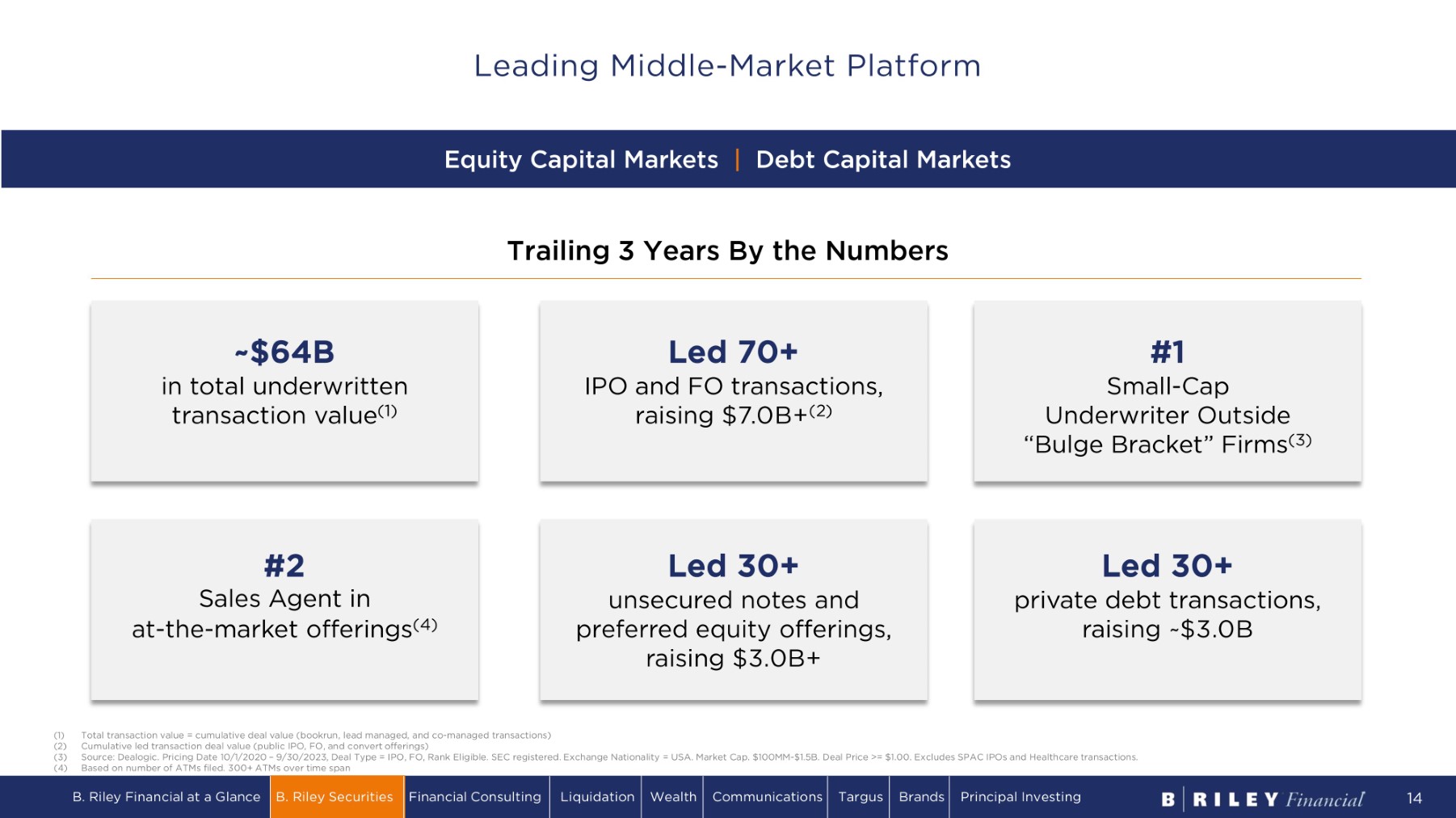 Broad institutional investor reach and deep expertise across research coverage ~400 companies under equity research coverage 1,000+ institutional investors covered Market maker in 1,400+ equity securities Our annual flagship conference, industry - specific conferences, and non - deal roadshows bring together hundreds of differentiated institutional investors and small - cap companies in events throughout the country Figures noted are approximations based upon the latest available data. 60+ sales and trading professionals Institutional Brokerage & Equity Research B. Riley Financial at a Glance B. Riley Securities Financial Consulting Liquidation Wealth Communications Targus Brands Principal Investing 13