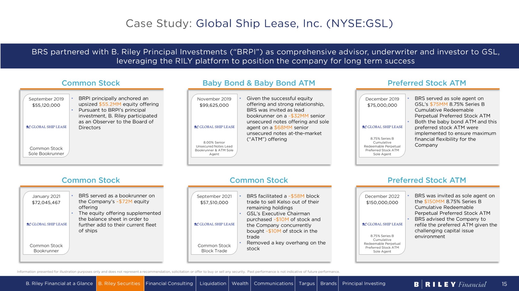 Information presented for illustration purposes only and does not represent a recommendation, solicitation or offer to buy or sell any security. Past performance is not indicative of future performance. Case Study: Global Ship Lease, Inc. (NYSE:GSL) BRPI principally anchored an upsized $55.2MM equity offering • Pursuant to BRPI’s principal investment, B. Riley participated as an Observer to the Board of Directors September 2019 • $55,120,000 Common Stock S o le B ook r unn e r • BRS served as a bookrunner on the Company’s ~$72M equity offering • The equity offering supplemented the balance sheet in order to further add to their current fleet of ships C o m m on S t oc k J a nu a r y 2 0 21 $72,045,467 C o m m o n S t ock Bookrunner BRS facilitated a ~ $ 58 M block trade to sell Kelso out of their remaining holdings • GSL’s Executive Chairman purchased ~$10M of stock and the Company concurrently bought ~$10M of stock in the trade • Removed a key overhang on the stock C o m m on S t oc k S e p t e m b e r 2 0 2 1 • $57,510,000 C o m m o n S t ock Block Trade Given the successful equity offering and strong relationship, BRS was invited as lead bookrunner on a ~$32MM senior unsecured notes offering and sole agent on a $68MM senior unsecured notes at - the - market (“ATM”) offering November 2019 • $99,625,000 8.00% Senior Unsecured Notes Lead Bookrunner & ATM Sole Agent BRS was invited as sole agent on the $150MM 8.75% Series B Cumulative Redeemable Perpetual Preferred Stock ATM • BRS advised the Company to refile the preferred ATM given the challenging capital issue environment Preferred Stock ATM December 2022 • $150,000,000 8.75% Series B Cumulative R e d ee m a b l e P e r p e t u a l Preferred Stock ATM Sole Agent BRS served as sole agent on GSL’s $75MM 8.75% Series B Cumulative Redeemable Perpetual Preferred Stock ATM • Both the baby bond ATM and this preferred stock ATM were implemented to ensure maximum financial flexibility for the Company BRS partnered with B. Riley Principal Investments (“BRPI”) as comprehensive advisor, underwriter and investor to GSL, leveraging the RILY platform to position the company for long term success Common Stock Baby Bond & Baby Bond ATM Preferred Stock ATM December 2019 • $75,000,000 8.75% Series B Cumulative R e d ee m a b l e P e r p e t u a l Preferred Stock ATM Sole Agent B. Riley Financial at a Glance B. Riley Securities Financial Consulting Liquidation Wealth Communications Targus Brands Principal Investing 1 5
