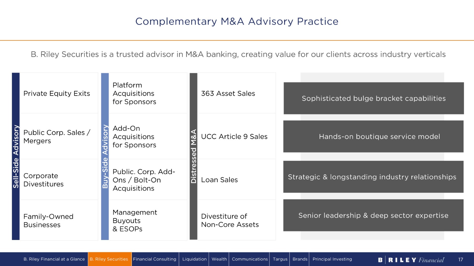 Creating a Diversified, Comprehensive Platform • M&A advisory • Equity capital markets • Research coverage • Share buybacks • Corporate access • ATMs & CEFs • Debt capital markets • SPAC IPO & advisory • Fixed income • Restructuring & r e c a p i t a li z a t i o ns • Private markets T e c hn ol o g y, Media & Telecom C o ns u m e r Ge n e r a li s t • M&A advisory • Burgeoning equity capital markets • Small - cap research coverage • Share buybacks • Co r p o r a t e a cc e ss 2015 Capabilities 2023 Capabilities ~40 Senior P r o d u c e r s (1) (1) Producers include investment banking calling officers, sales traders and publishing research analysts Bu s i n e ss Services Business & F i n a n c i a l Services B. Riley Financial at a Glance B. Riley Securities Financial Consulting Liquidation Wealth Communications Targus Brands Principal Investing 16 D i v e r s i f ie d Industrials Energy & Natural Resources Healthcare Real E s t a te G e n e r a li s t Technology, Media & Telecom C on s u m e r >130 Senior P r o d u c e r s (1)